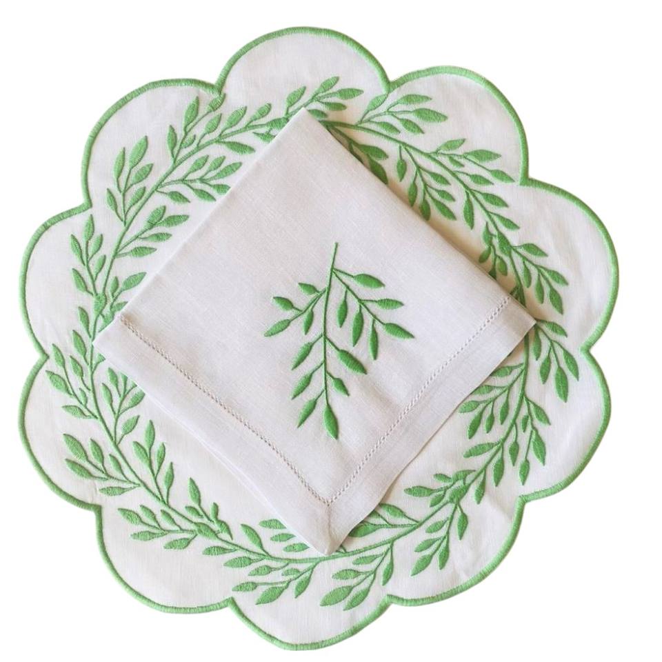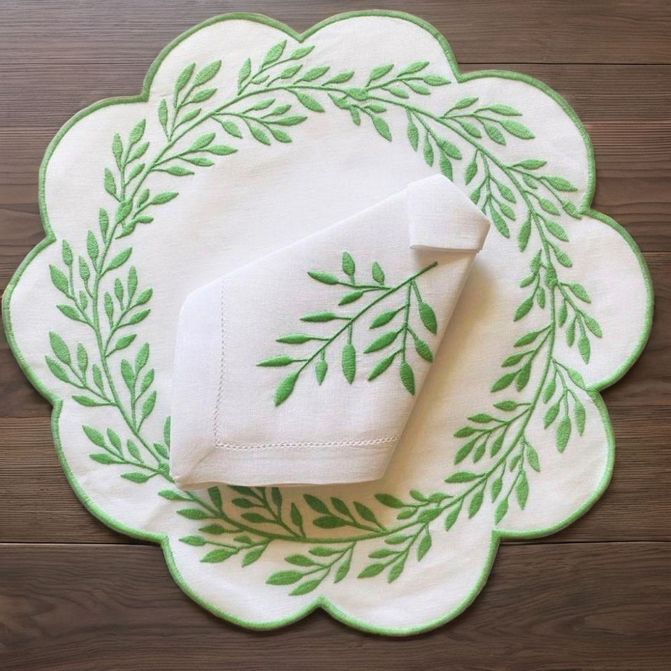 ชุดผ้าเช็ดปากและแผ่นรองจานผ้าฝ้ายสีขาวปักลายใบไม้สีเขียวและขอบหอยเชลล์สำหรับใช้ในบ้านและร้านอาหาร