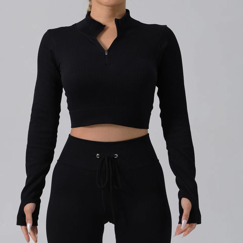 เสื้อครอปออกกำลังกายผู้หญิง แขนยาว สำหรับโยคะ วิ่ง ฟิตเนส ซิปหน้า รับผลิตตามสั่ง ขายส่ง