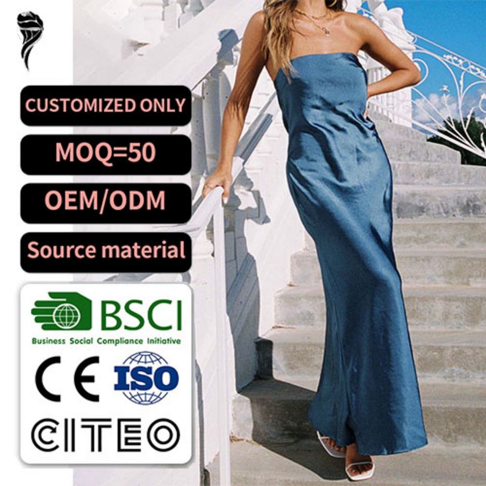 เดรสยาวแม็กซี่ผ้าซาตินเนื้อนุ่มสำหรับผู้หญิง สไตล์หรูหราสำหรับฤดูร้อน แบบไร้สายรัดไหล่ รัดเชือกด้านหลัง ทรงเข้ารูป รับผลิตตามสั่งขายส่ง