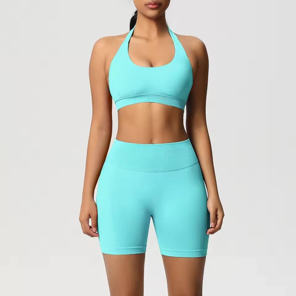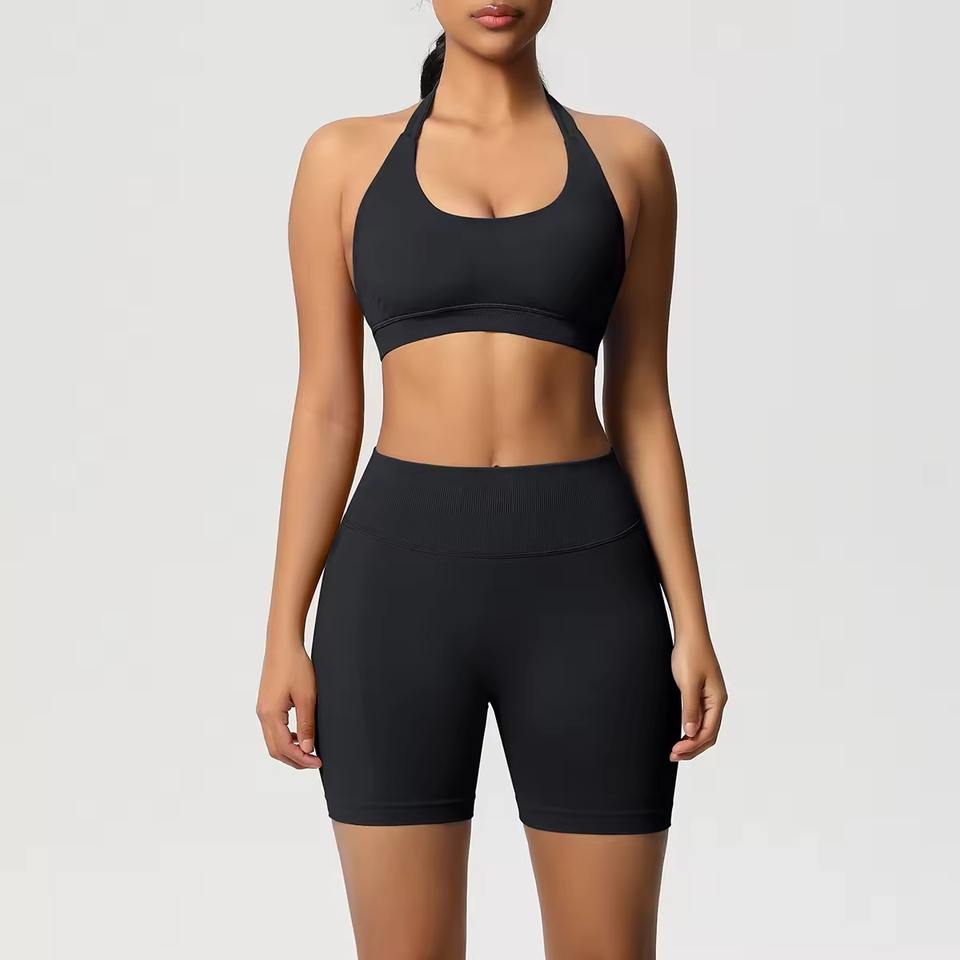 ชุดโยคะสีพื้นแบบใหม่สำหรับผู้หญิง ขายส่งตามสั่ง ชุดออกกำลังกายสองชิ้น เสื้อชั้นในกีฬาแบบมีโครงและกางเกงขาสั้นต้านเชื้อแบคทีเรีย
