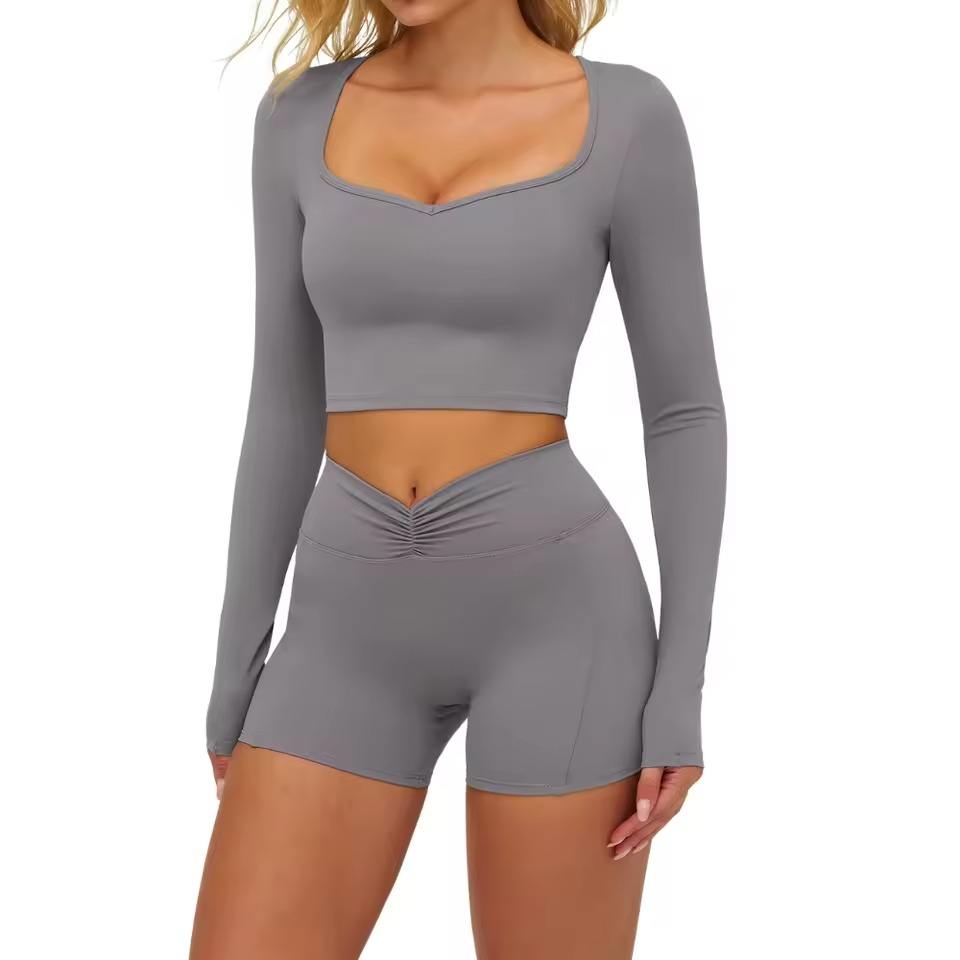 Custom Wholesale Womens Seamless Workout Set Short Sleeve Crop Top & High Waist Ribbed Biker Shorts for Running
