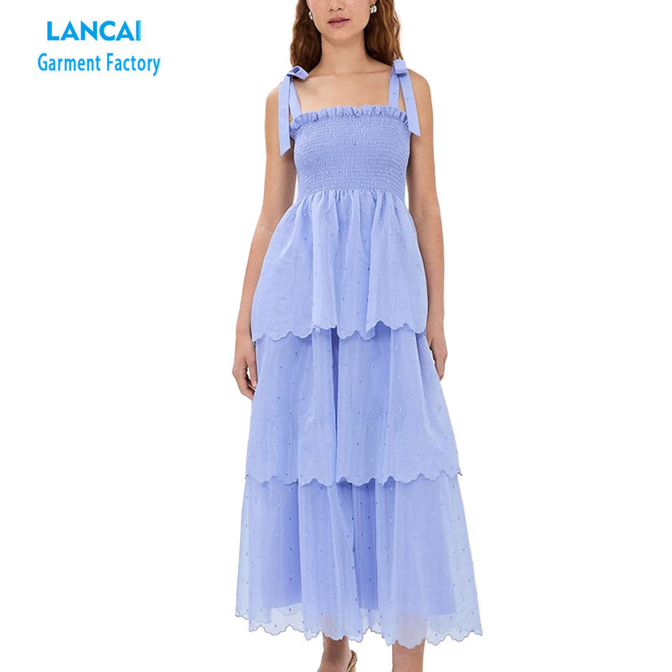 ชุดเดรสยาวของผู้หญิงสายรัดแบบผูกคอกว้างแต่งระบายจีบ