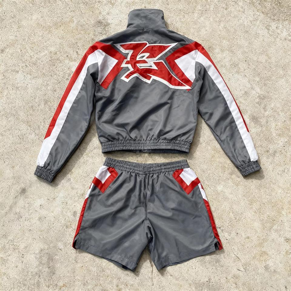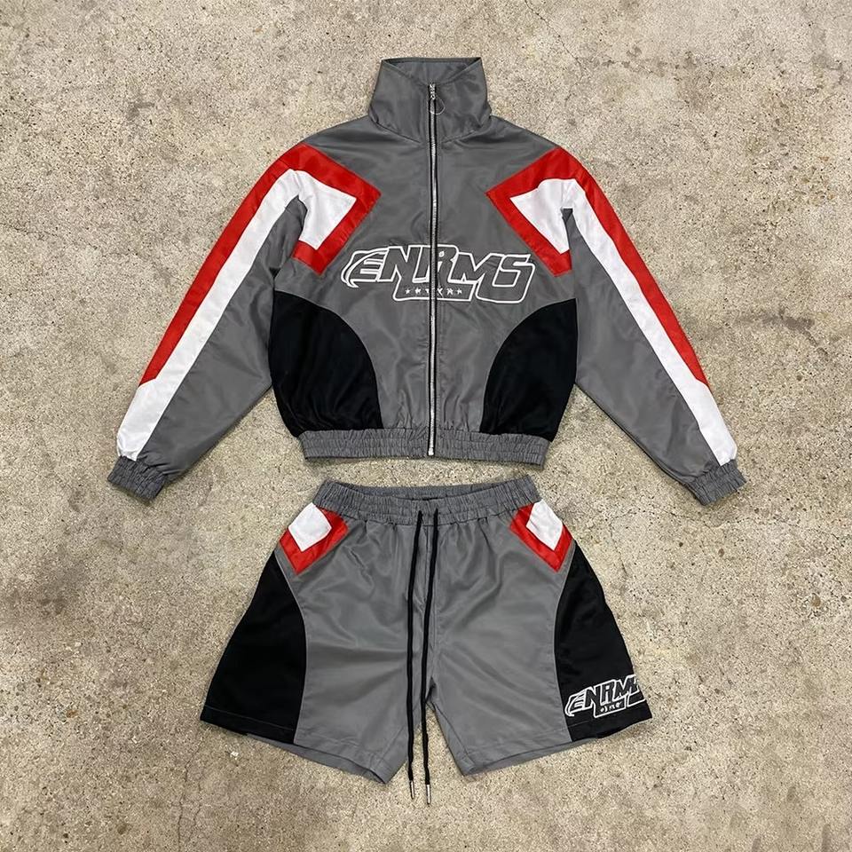 ชุดเซ็ตเสื้อแจ็คเก็ตกันลมแบบสั้น กางเกงขาสั้นผ้าซอฟต์เชลล์ ชุดกีฬากลางแจ้ง ไนลอน กันฝน กันลม
