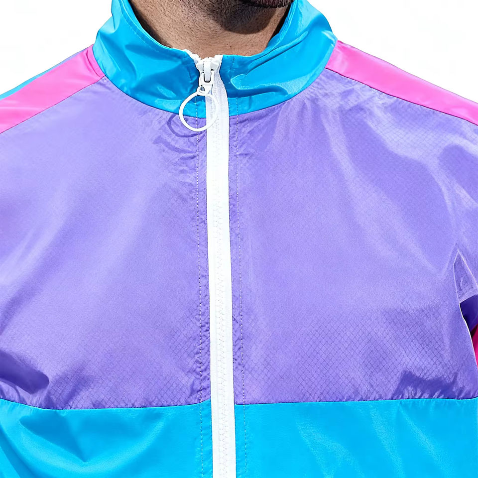 เสื้อแจ็คเก็ตวินด์เบรกเกอร์แขนสั้นแบบมีซิป ชุดวอร์มไนลอนสีสันตัดกัน ชุดวอร์มสำหรับวิ่งมาราธอน