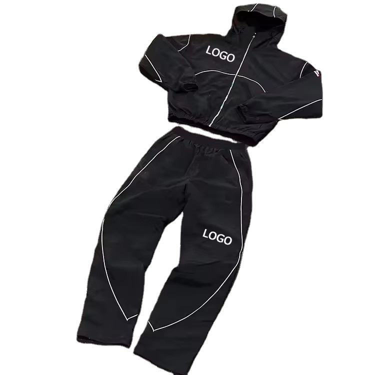 ชุดวอร์มกันลมแบบมีฮู้ดสองชิ้น ชุดเซ็ตเสื้อแจ็คเก็ตซิปและกางเกงขาสั้นสำหรับผู้ชาย ชุดวอร์มสะท้อนแสง ชุดวอร์มจ็อกเกอร์สำหรับผู้ชาย