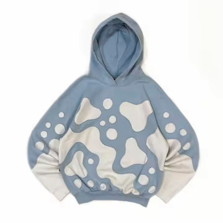เสื้อฮู้ดผ้าฟลีซหนานุ่มแบบสองสี ตัดเย็บด้วยเทคนิคแพทช์เวิร์ค พร้อมตะเข็บตัดกัน ทรงหลวมแบบดรอปโชว์เดอร์ ใส่ได้ทั้งชายและหญิง