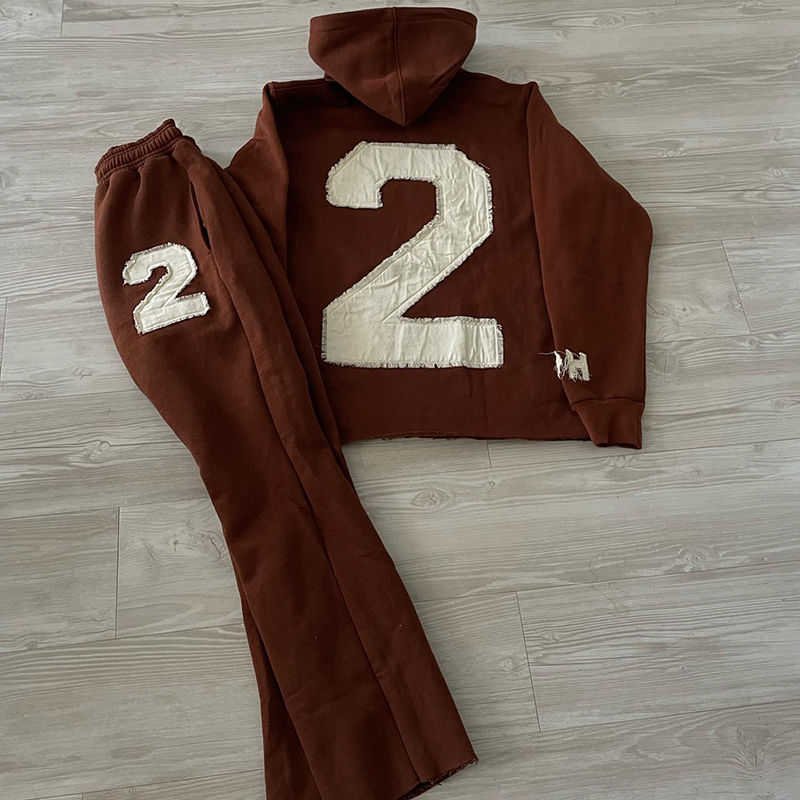 ชุดเซ็ตเสื้อฮู้ดดี้และกางเกงวอร์มสตรีทแวร์สำหรับฤดูหนาว แต่งลายปัก แอพพลิเค่ ดีไซน์ทำสีซีดแบบย้อนยุค ล้างสีแบบแอซิดวอช ทรงขาบาน