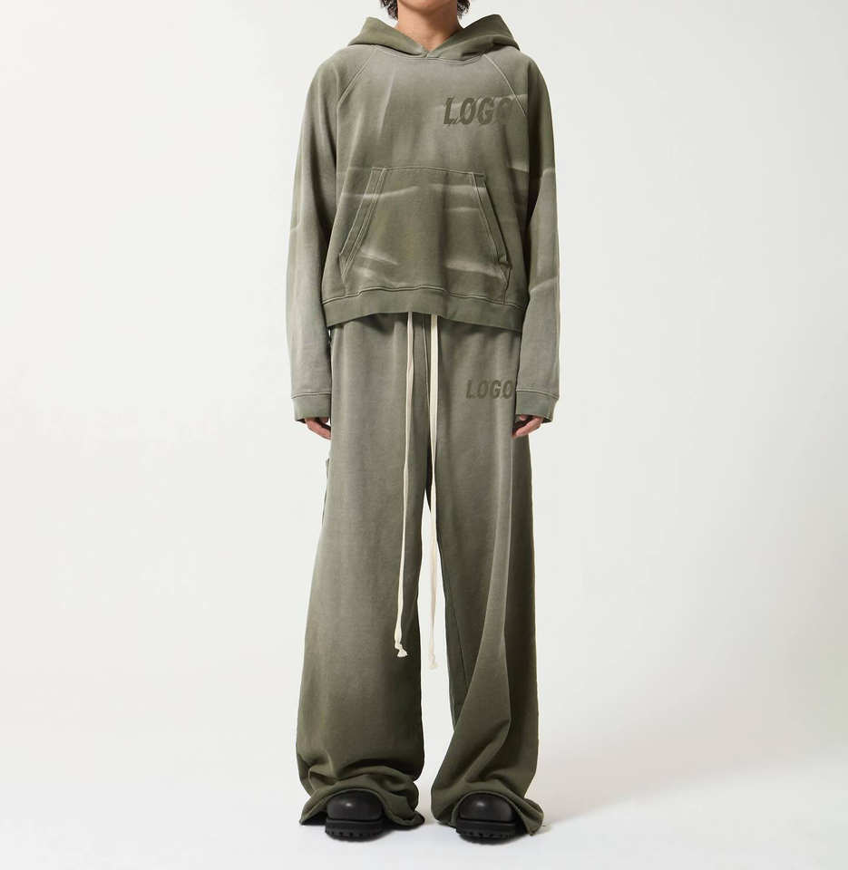 ชุดเซ็ตสเวตแพนท์ฮู้ดดี้ทรงแบ็กกี้ผ้าเฟรนช์เทอร์รี่หนา 460gsm สไตล์วินเทจฟอกสีซีดแบบซันเฟด ล้างสีแบบแอซิดวอช สำหรับผู้ชาย
