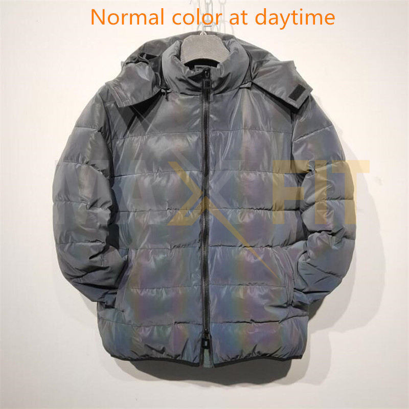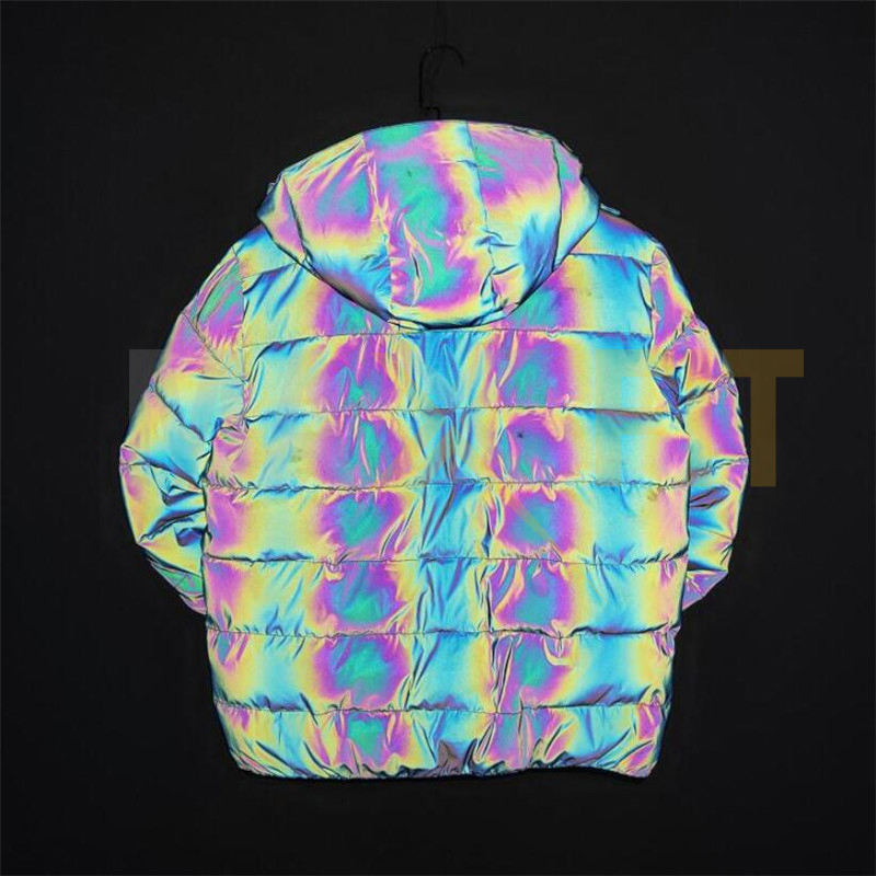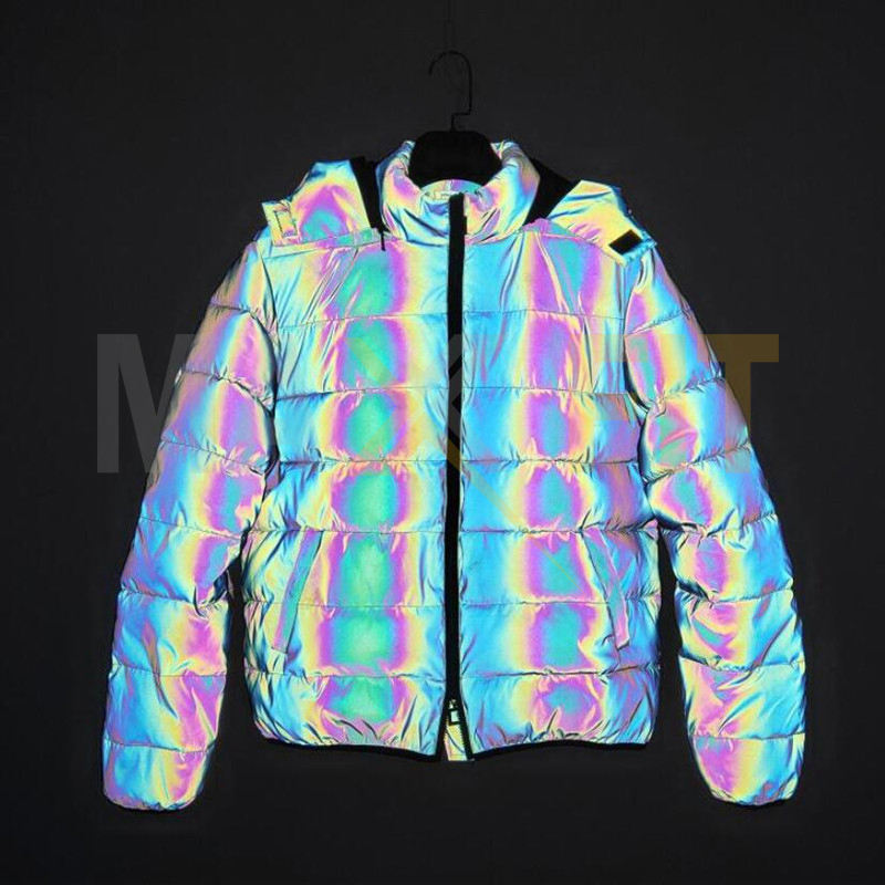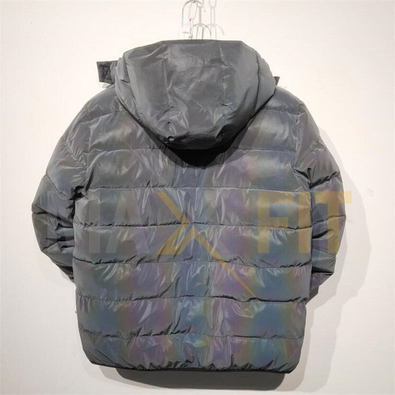 แจ็คเก็ตบอมเบอร์ผู้ชายแบบพัฟเฟอร์สีรุ้งสะท้อนแสงสำหรับฤดูหนาว ผ้าแคนวาส คอตั้ง กันน้ำ กันลม