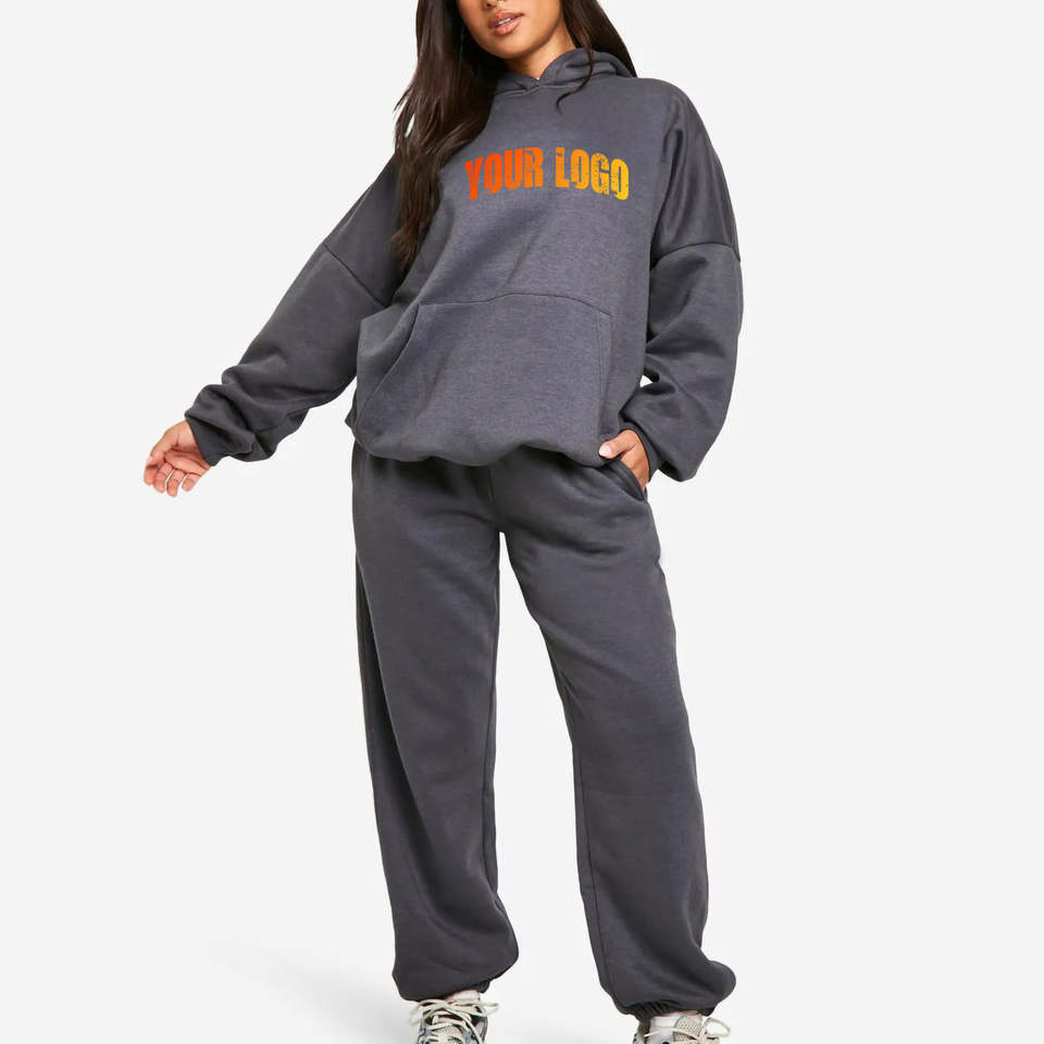ชุดวอร์มกำมะหยี่ปักลายแบบกำหนดเองสำหรับฤดูหนาว เสื้อฮู้ดทรงโอเวอร์ไซส์แบบซิปและกางเกงวอร์มทรงหลวม ชุดเซ็ต 2 ชิ้นสำหรับผู้หญิง