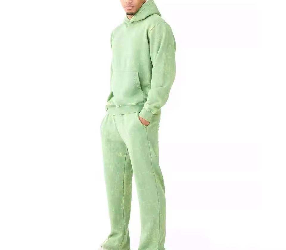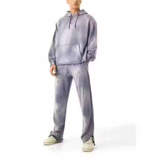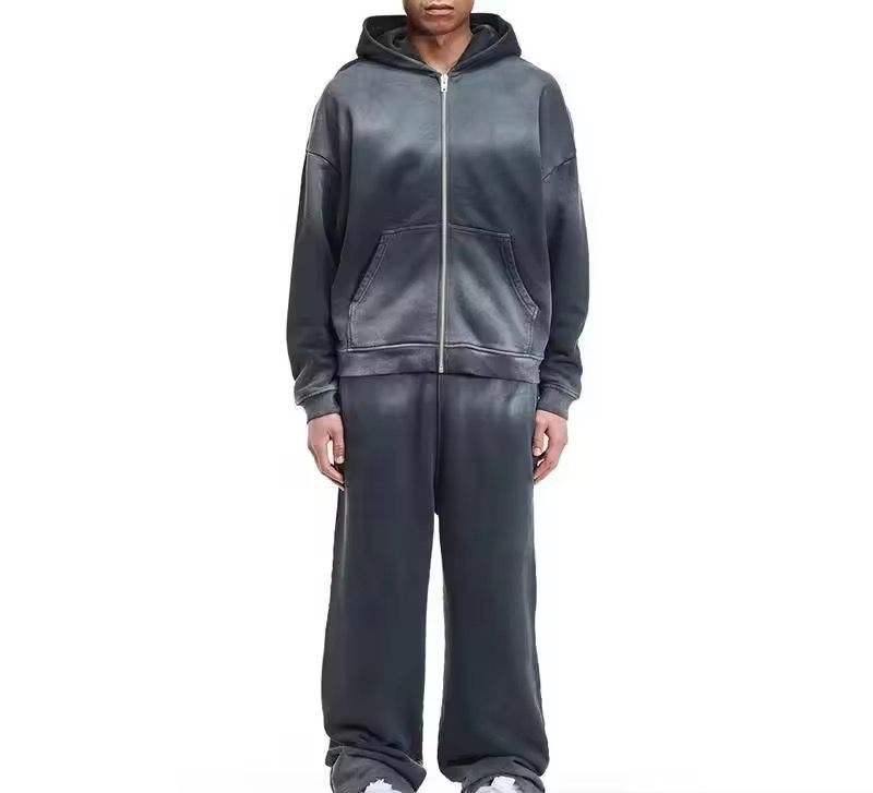 ชุดเซ็ตแทรคสูทแบบซิป ฮู้ดดี้ผ้าสเวตวอชลายพิมพ์สไตล์วินเทจ พร้อมกางเกงขายาวทรงบานแบบดิสเทรส
