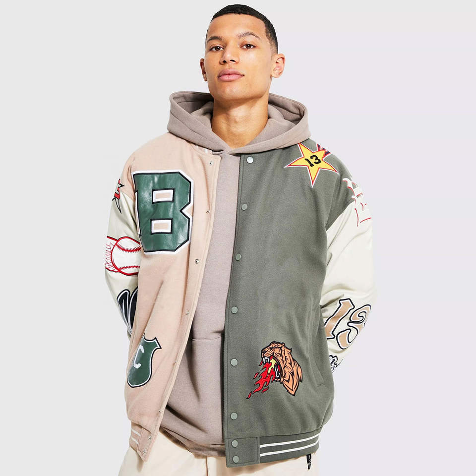 แจ็คเก็ตสไตล์วาร์ซิตี้ลำลองแบบสปอร์ตสำหรับฤดูหนาว สีเทาเบจตัดขาว แขนเสื้อสีขาว ปลายแขนเสื้อมีแถบลาย แบบบอมเบอร์เลตเตอร์แมน