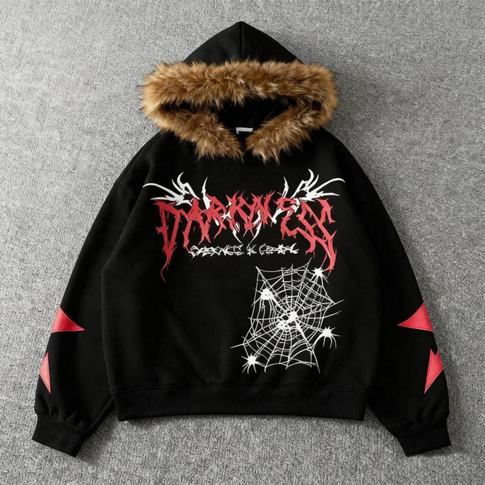 เสื้อฮู้ดกันลมแบบกำหนดเองสำหรับฤดูหนาว พร้อมปกขนสัตว์ สไตล์สตรีทแวร์ ปักลายแบบกำหนดเอง พิมพ์ลายดิจิทัล ทรงหลวมไหล่ตก ทรงโอเวอร์ไซส์
