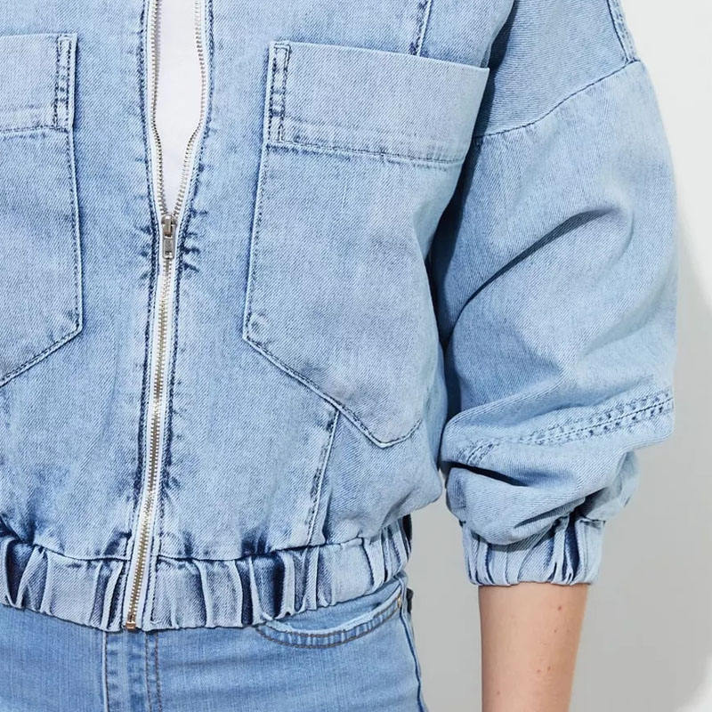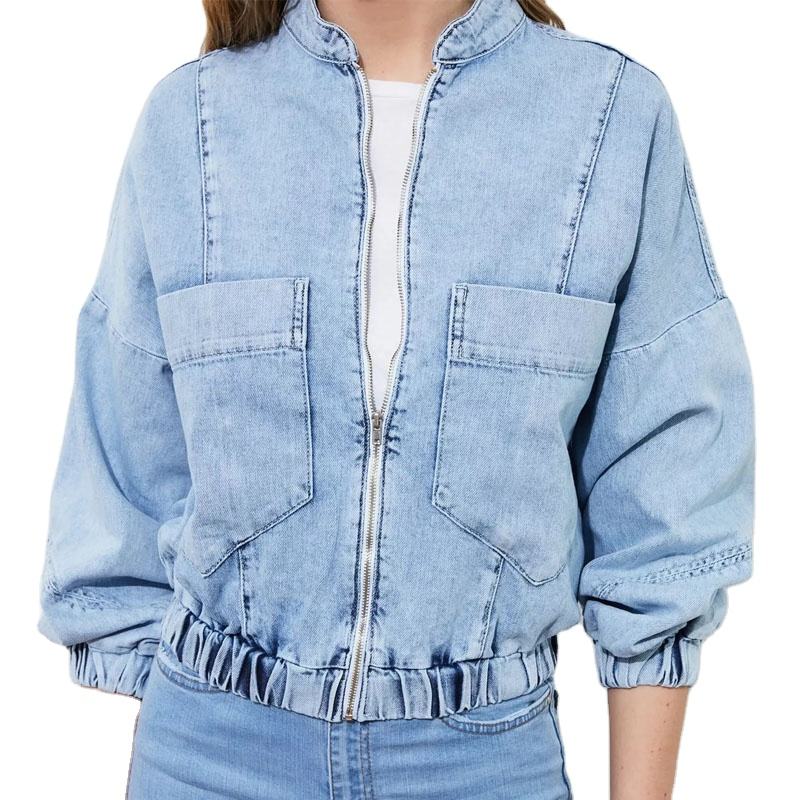 เสื้อแจ็กเก็ตผ้ายีนส์ของผู้หญิงสำหรับฤดูหนาวแบบกำหนดเองผ้าฝ้ายซักพร้อมกระเป๋าคาดเอวแบบลำลอง