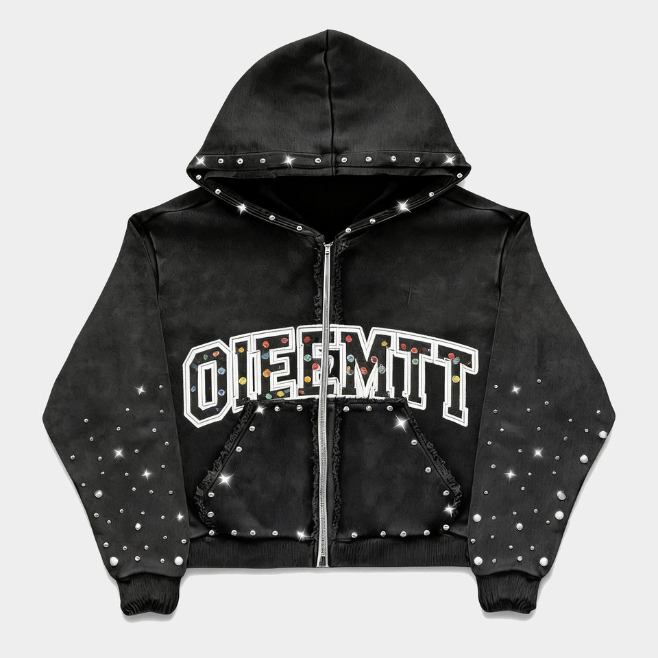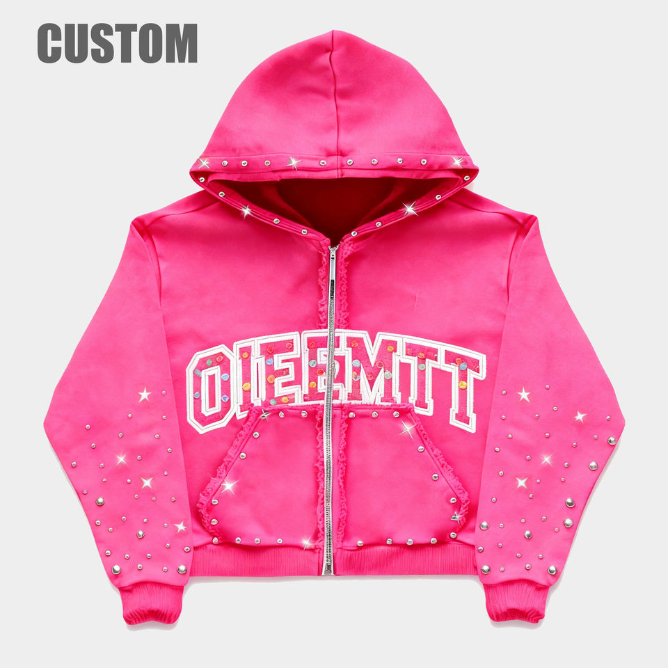 เสื้อฮู้ดดี้ผู้หญิงแบบครอป ผ้าฟลีซ 100% คอตตอน 450 GSM ล้างสีแบบ Acid Wash สไตล์โอเวอร์ไซส์ แต่งซิปและคริสตัล สำหรับฤดูหนาว