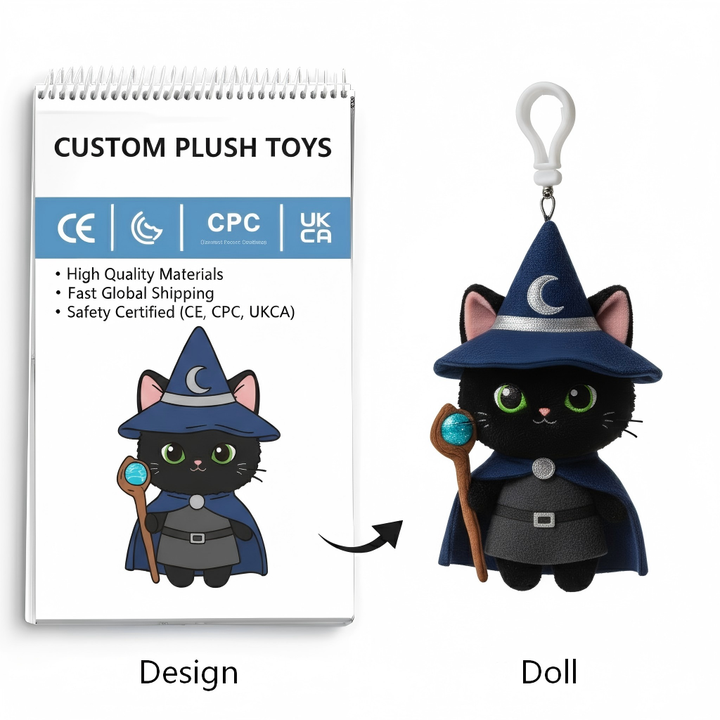 พวงกุญแจตุ๊กตาแมววิเศษสั่งทำพิเศษ ได้รับการรับรองความปลอดภัย CE CPC ผู้ผลิตของเล่นตุ๊กตาสัตว์ ตุ๊กตาแมวแม่มดเวทมนตร์สั่งทำได้