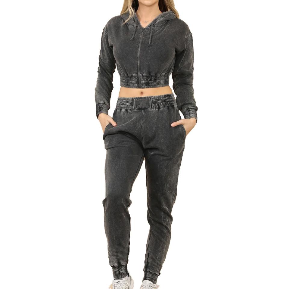 ชุดวอร์มมีฮู้ดสำหรับผู้หญิง สไตล์ลำลอง ระบายอากาศได้ดี แบบครอป มีเชือกผูกเอว ลุคย้อนยุค ล้างสีแบบแอซิดวอช พร้อมกางเกงจ็อกเกอร์