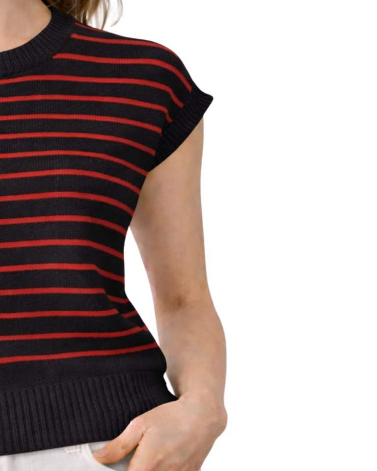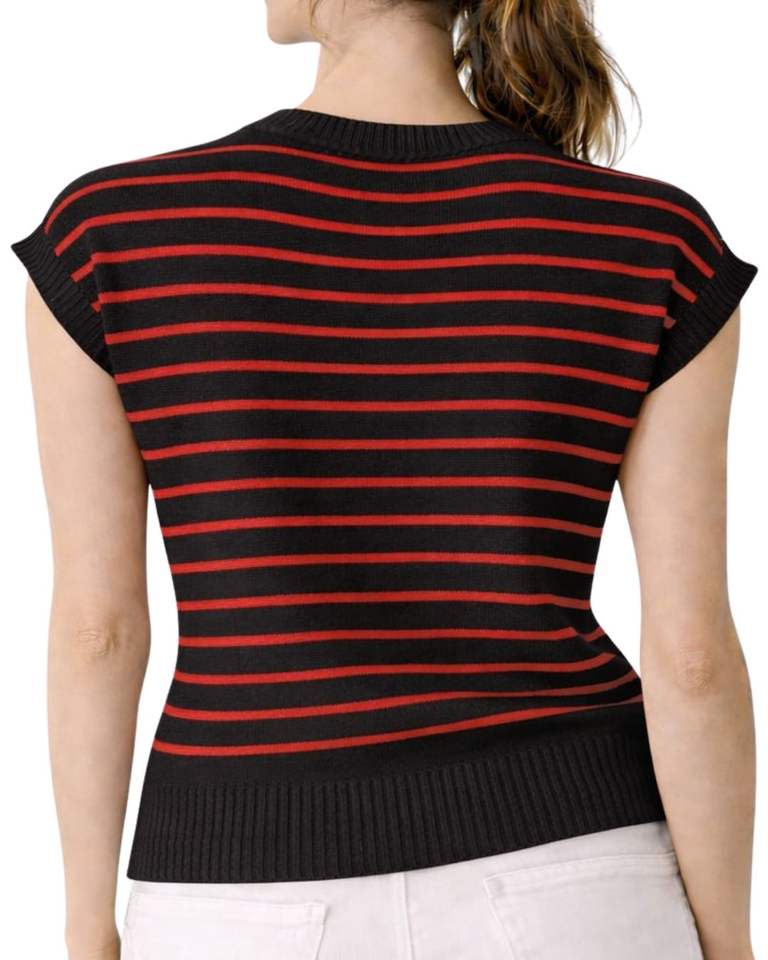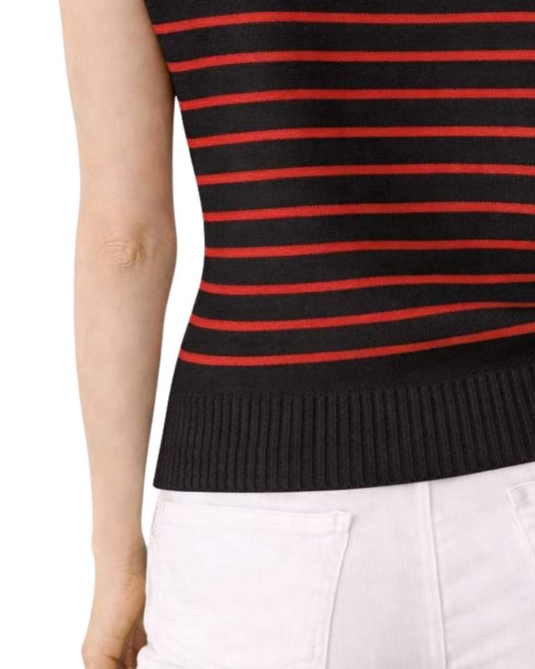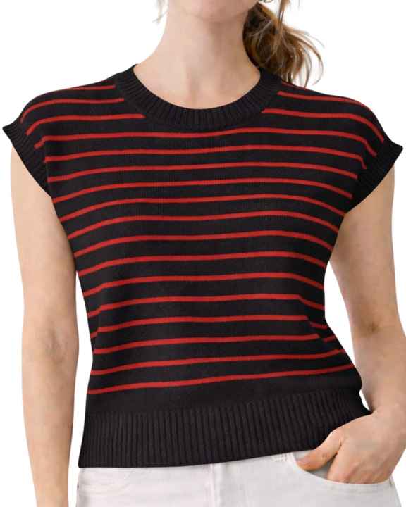 เสื้อกั๊กไหมพรมแขนกุดลายทางสีดำแดงสำหรับผู้หญิง คอกลม น้ำหนักเบา สวมใส่สบายๆ แฟชั่นฤดูร้อนสำหรับผู้หญิง