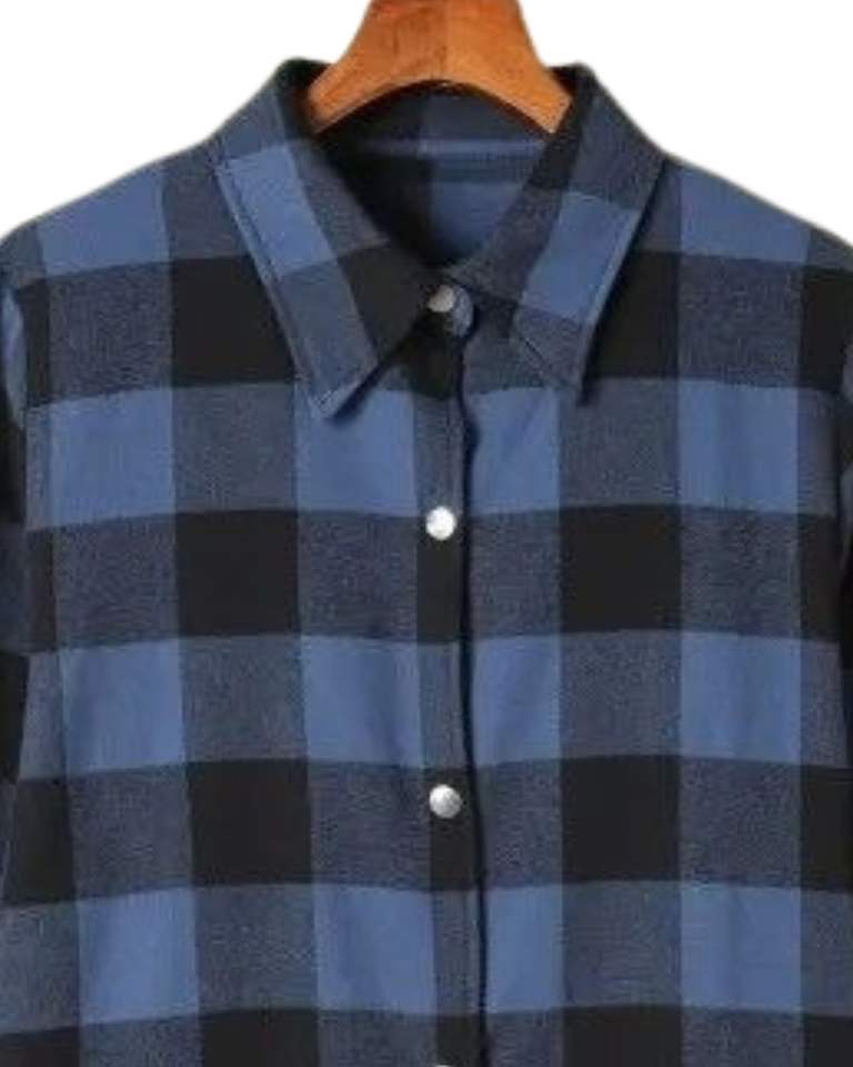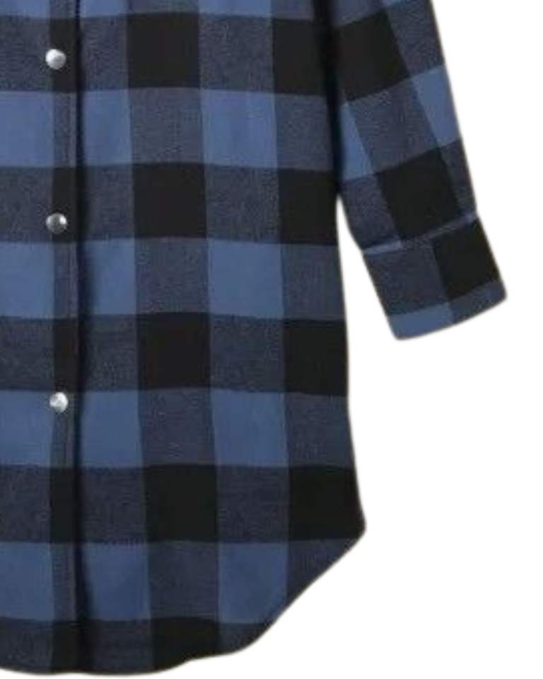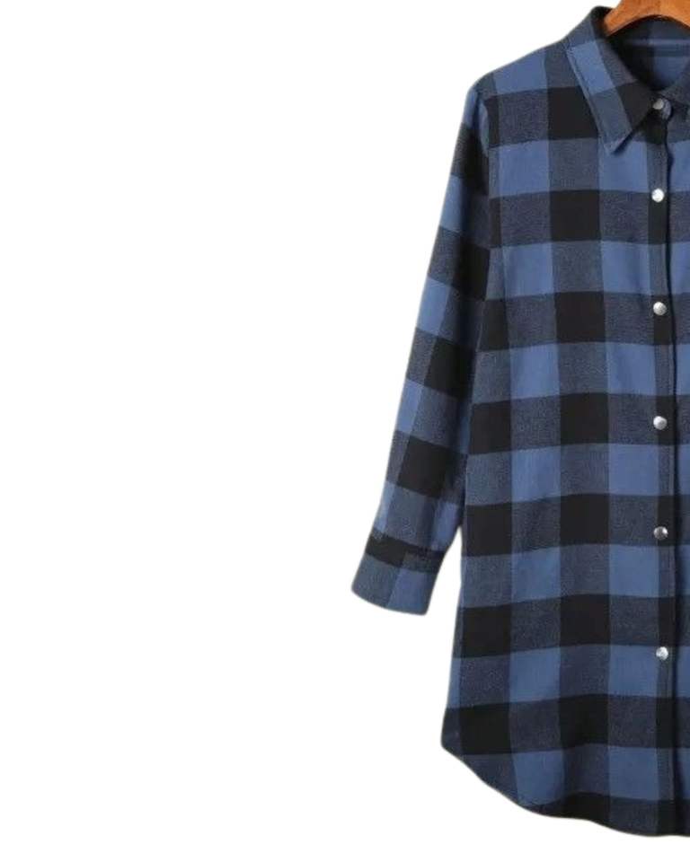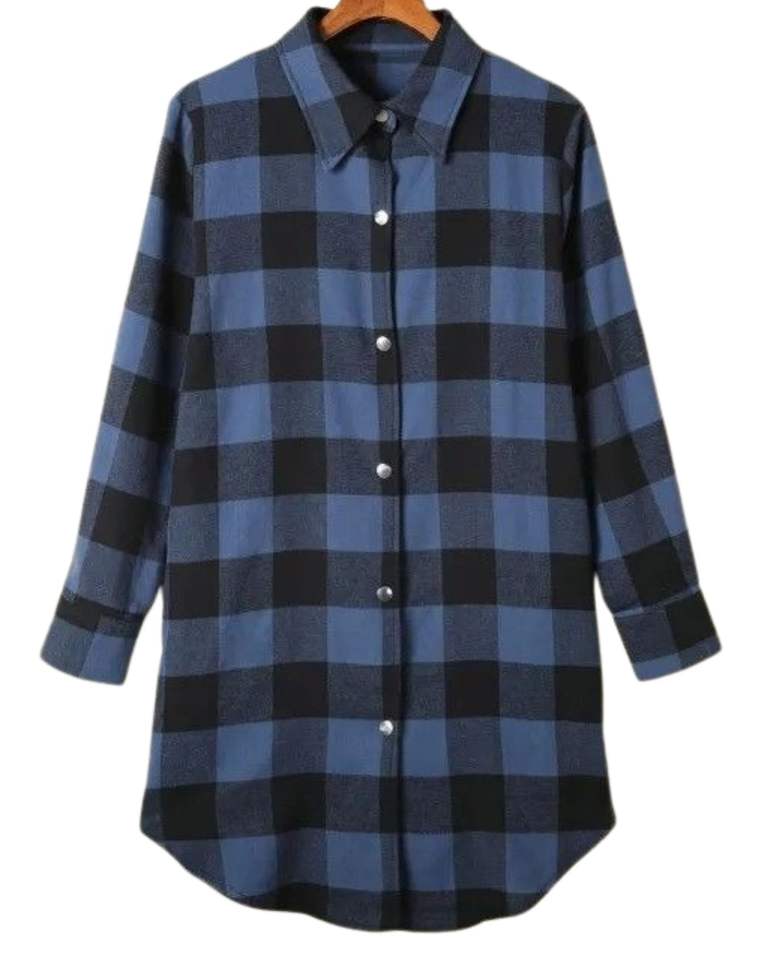 เดรสเชิ้ตผู้หญิงลายสก็อตสีน้ำเงินดำ แขนยาว ติดกระดุม สไตล์ลำลอง ทรงหลวม ผ้าฝ้ายลินินเนื้อนุ่ม