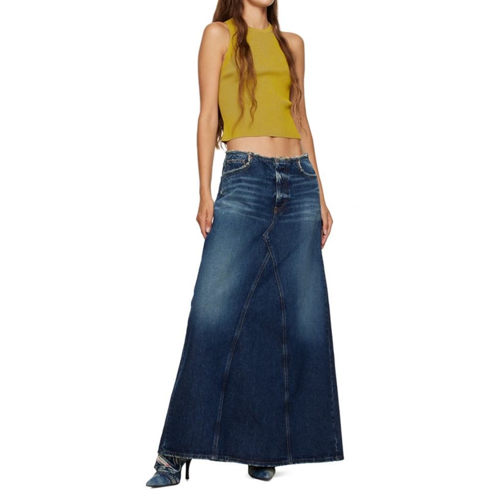 กระโปรงยีนส์ยาวทรงแม็กซี่สีน้ำเงินสำหรับผู้หญิง ขอบดิบ ติดกระดุม