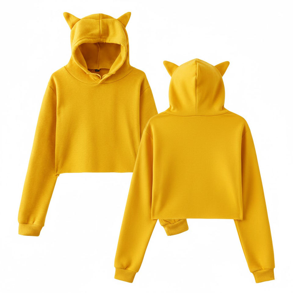 เสื้อฮู้ดครอปสีเทาสำหรับผู้หญิง แต่งหูน่ารัก ผ้าฝ้ายนุ่ม สวมใส่สบาย สไตล์สตรีทแวร์ เสื้อครอปท็อป