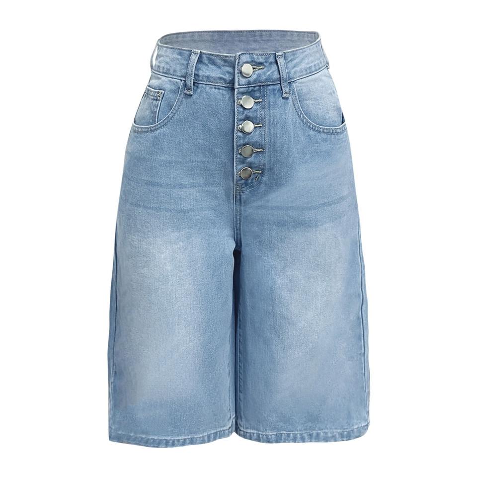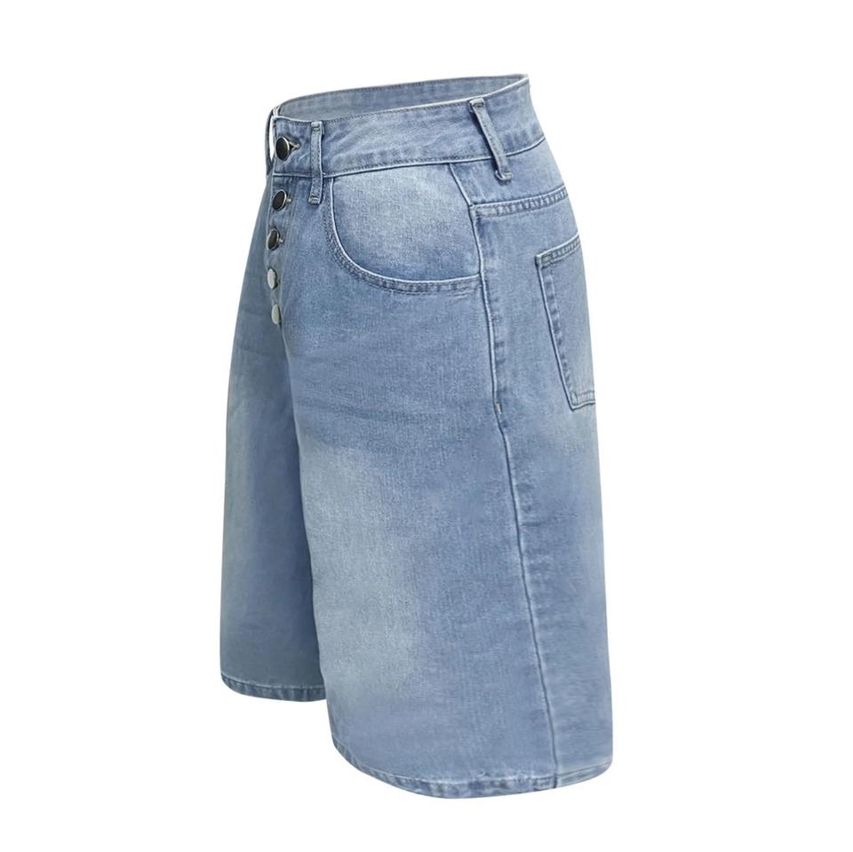 กางเกงยีนส์ขาสั้นเอวสูงคุณภาพดีสำหรับผู้หญิง กระดุมผ่าหน้า ทรงขากว้าง สไตล์ลำลอง แฟชั่น ขายส่ง