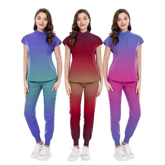 ชุดยูนิฟอร์มพยาบาล/แพทย์ ผ้าถักผสมสแปนเด็กซ์/โพลีเอสเตอร์ สีไล่ระดับ สำหรับผู้หญิง ชุดทำงานโรงพยาบาล/คลินิกทันตกรรม/เสริมสวย แบบจ็อกเกอร์