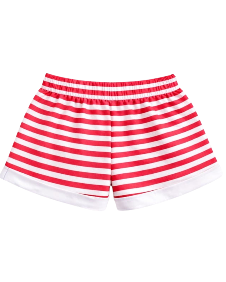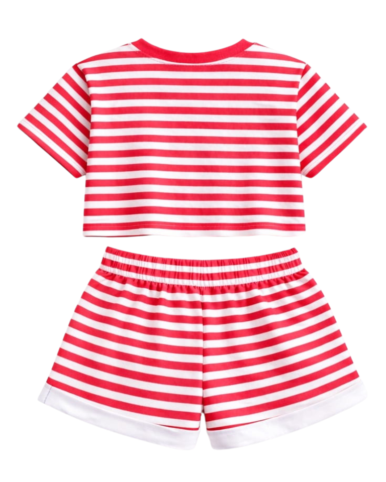 ชุดเซ็ตเสื้อครอปและกางเกงขาสั้นลายทางหลากสีสำหรับผู้หญิง สไตล์ลำลองสำหรับฤดูร้อน ชุดสองชิ้น เอวยางยืด ชุดลำลองใส่สบายๆ สตรีทแวร์ รับผลิตแบบ OEM