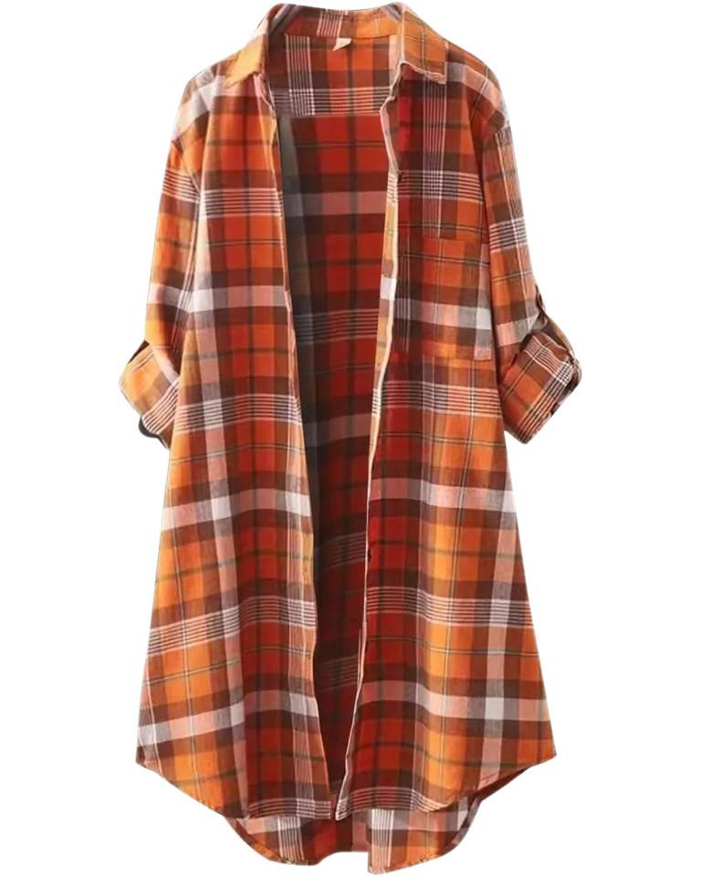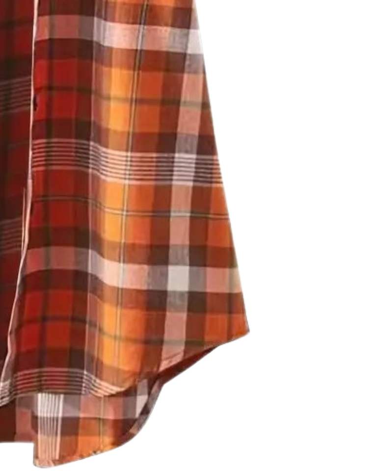 เดรสเชิ้ตผู้หญิงลายสก็อตสีส้ม แขนยาว ติดกระดุม สไตล์ลำลอง ทรงหลวม ผ้าฝ้ายลินินเนื้อนุ่ม