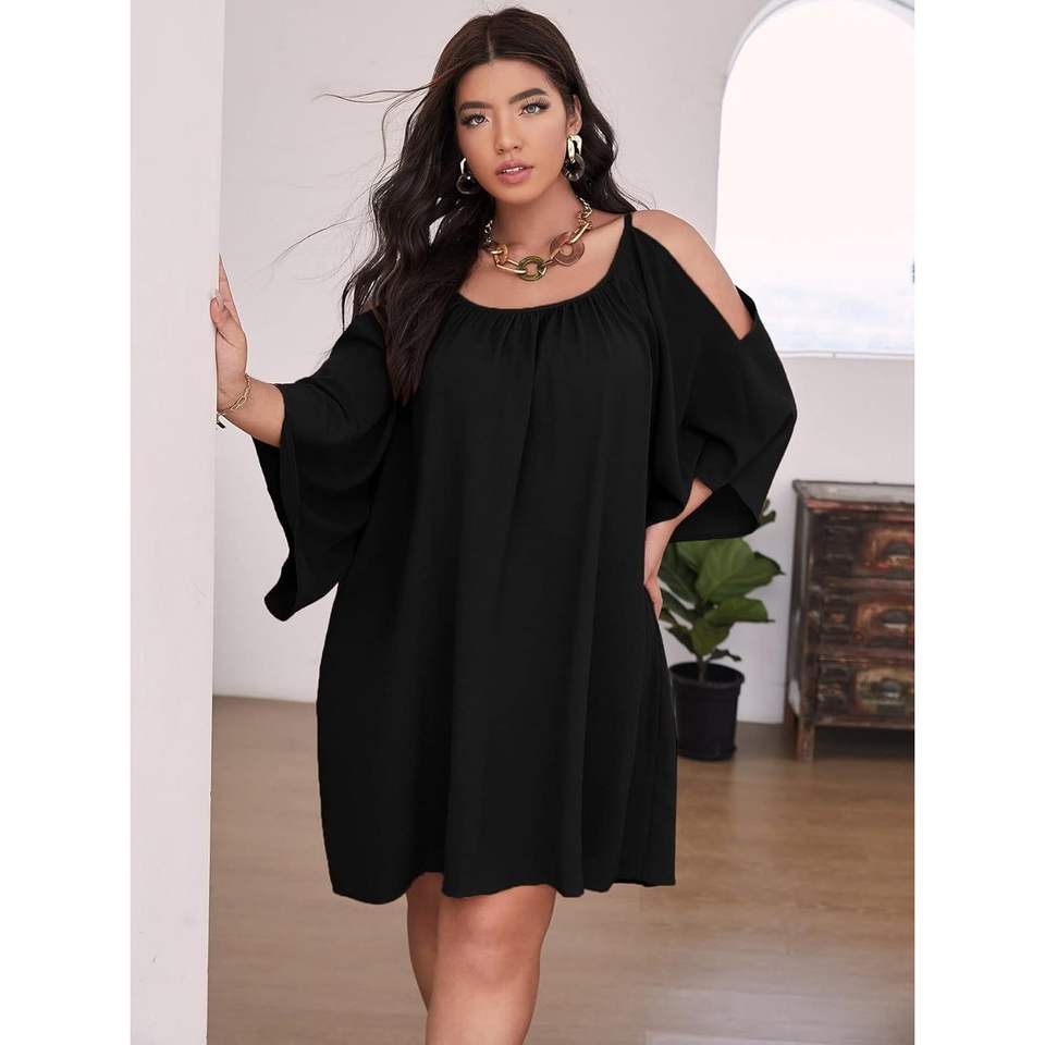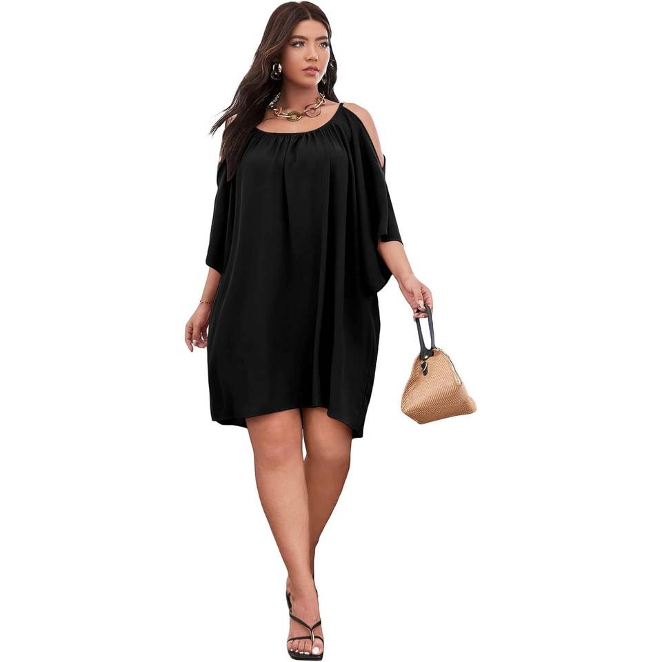 ชุดเดรสผู้หญิงไซส์ใหญ่สำหรับฤดูร้อน แบบเปิดไหล่ ทรงหลวม สวมใส่สบาย แขนสั้น ระบายอากาศได้ดี เหมาะสำหรับใส่ในชีวิตประจำวัน