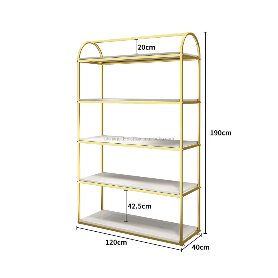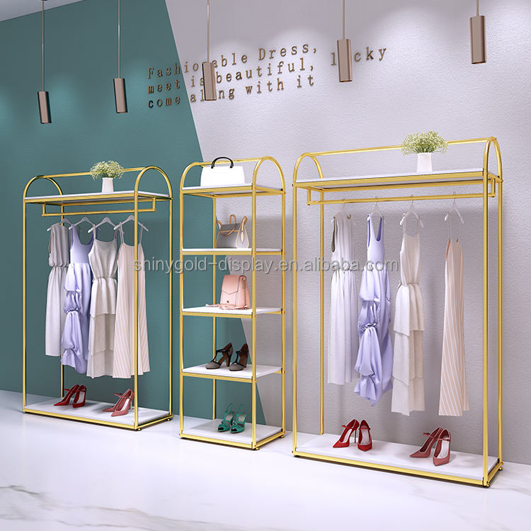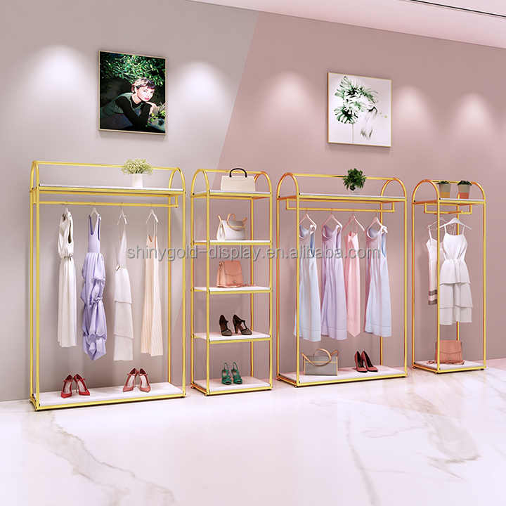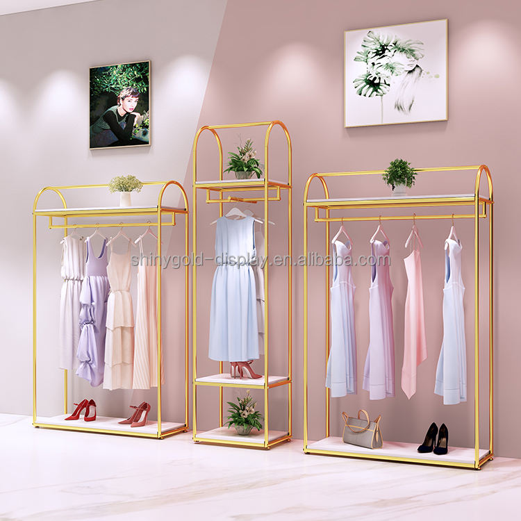 ที่กำหนดเองผู้หญิงขายปลีกเสื้อผ้ายืนแสดงสแตนเลสติดผนังชั้นวางเสื้อผ้าโลหะทองบูติกชั้นวางเสื้อผ้าสำหรับเสื้อผ้า