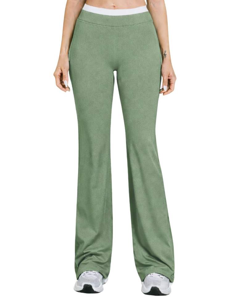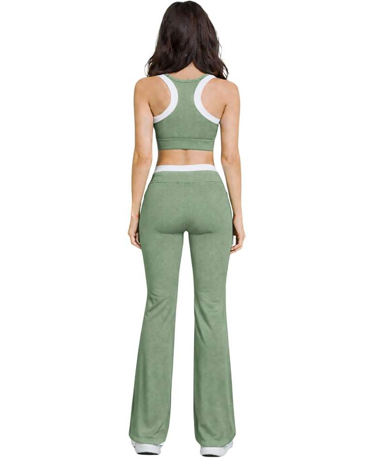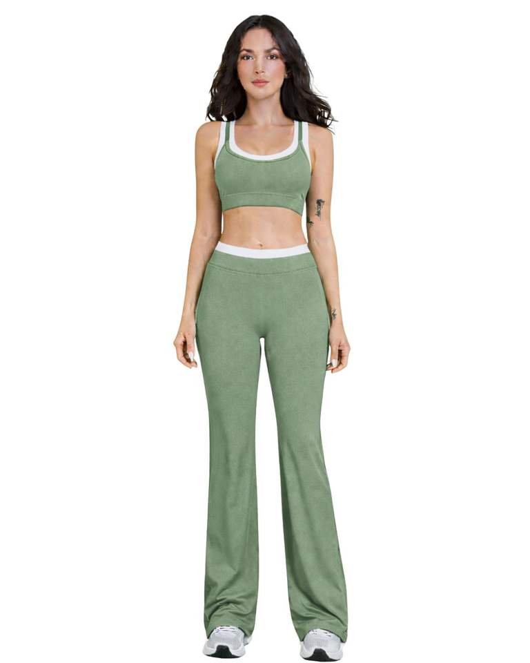 ชุดออกกำลังกายผู้หญิงสีเขียวเซจตัดขาว ประกอบด้วยเสื้อชั้นในกีฬาและกางเกงขาบานเอวสูง ผ้าสเตรช เหมาะสำหรับโยคะ ฟิตเนส และยิม รับผลิตตามแบบ (OEM) ขายส่ง