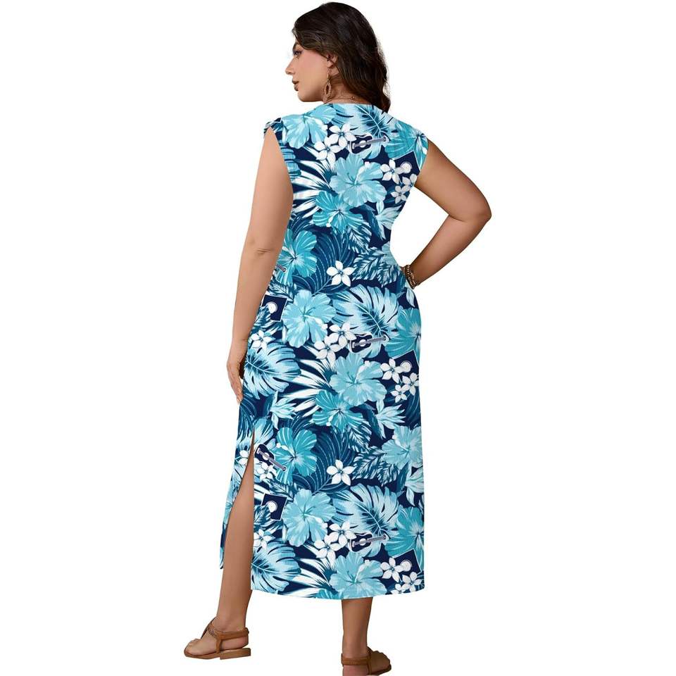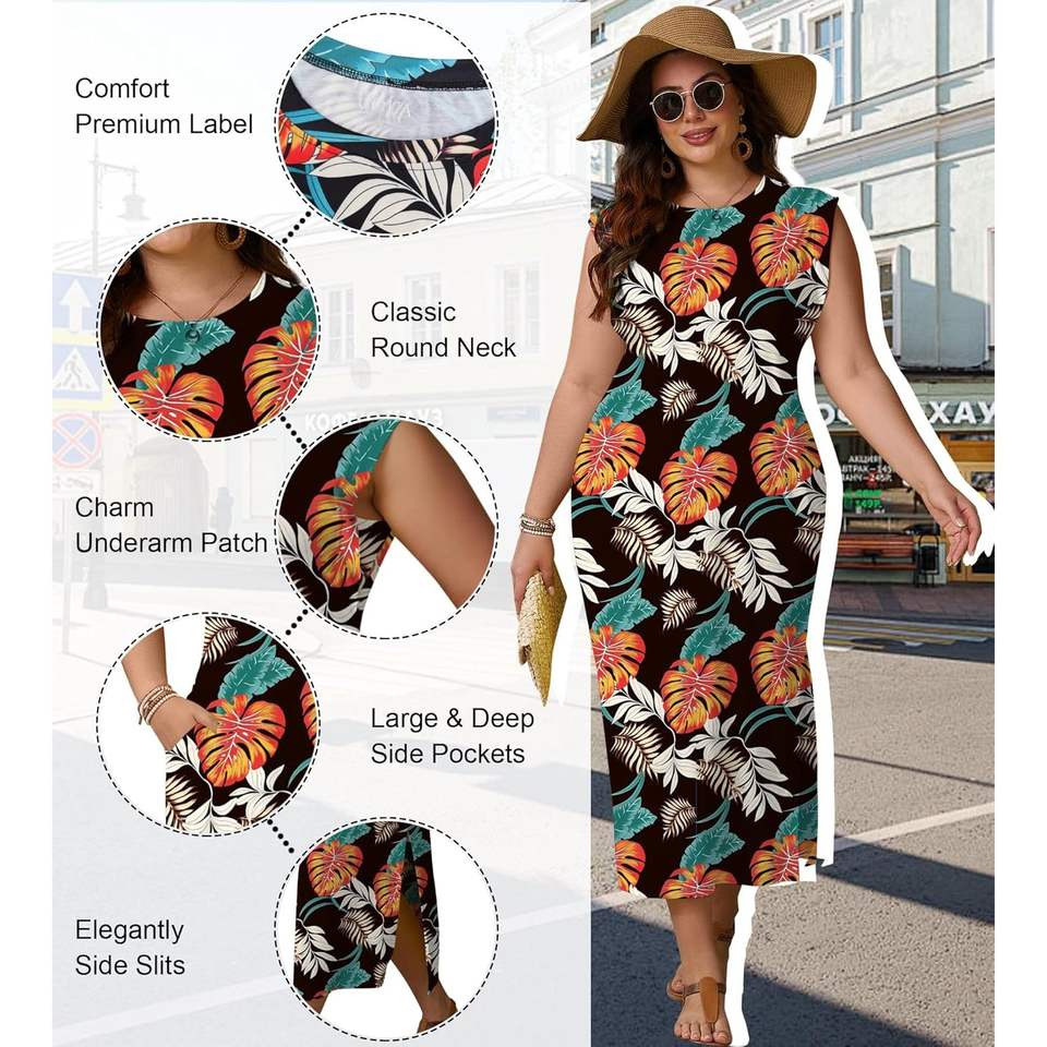 เดรสยาวฤดูร้อนสำหรับผู้หญิงไซส์ใหญ่ แบบไม่มีแขน คอทรงโอ ลายพิมพ์ฮาวาย ทรงหลวมใส่สบาย เหมาะสำหรับใส่ไปชายหาด มีรอยผ่าข้างและกระเป๋า