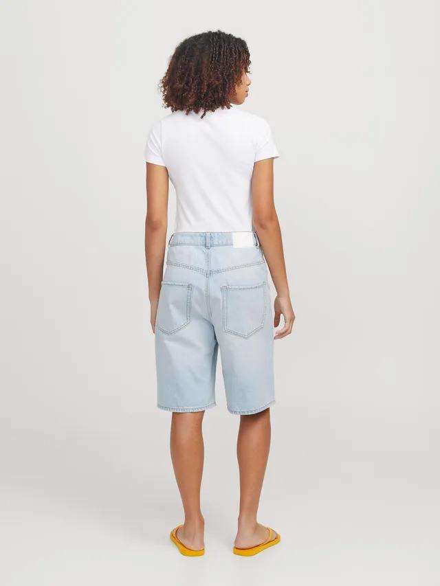 กางเกงยีนส์ขาสั้นเอวสูงทรงหลวมแฟชั่นสำหรับผู้หญิงขายส่งความยาวระดับเข่าสไตล์ลำลองสำหรับฤดูร้อน