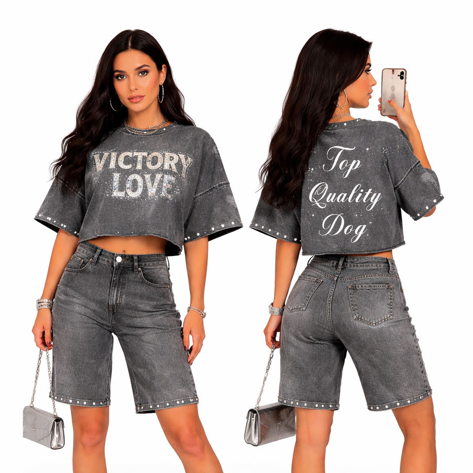 ชุดเซ็ตเสื้อครอปสีเทาแบบวินเทจและกางเกงยีนส์ขาสั้นสำหรับผู้หญิง สไตล์สตรีทแวร์ลำลองสำหรับฤดูร้อน ชุดสองชิ้นสำหรับสุภาพสตรี