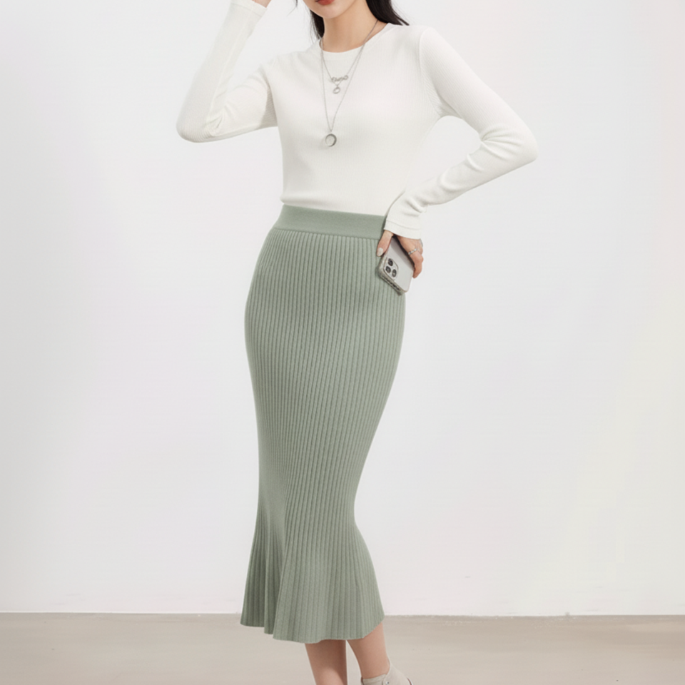 กระโปรงมิดิทรงเอเข้ารูปสำหรับผู้หญิง ผ้าขนสัตว์ถักลายริบ เอวสูง ทันสมัย ดูหรูหรา ผ้าเนื้อยืด สวมใส่สบาย