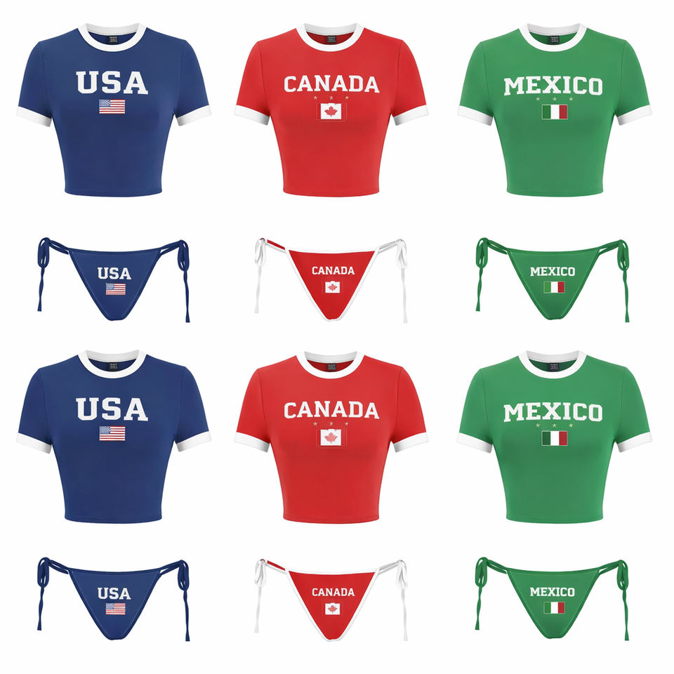 ชุดบิกินี่ครอปท็อปพิมพ์ลายธงชาติสำหรับผู้หญิง ชุดสองชิ้นสำหรับแฟนฟุตบอล ชุดว่ายน้ำชายหาดฤดูร้อน