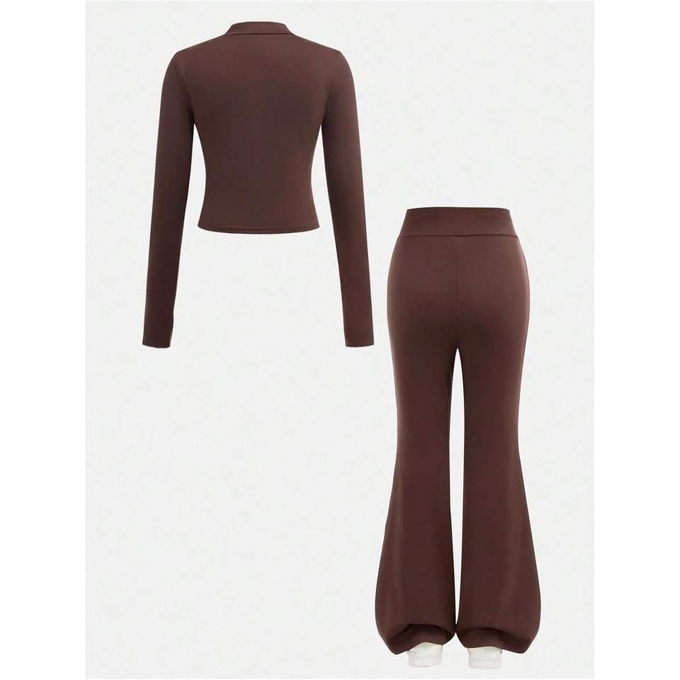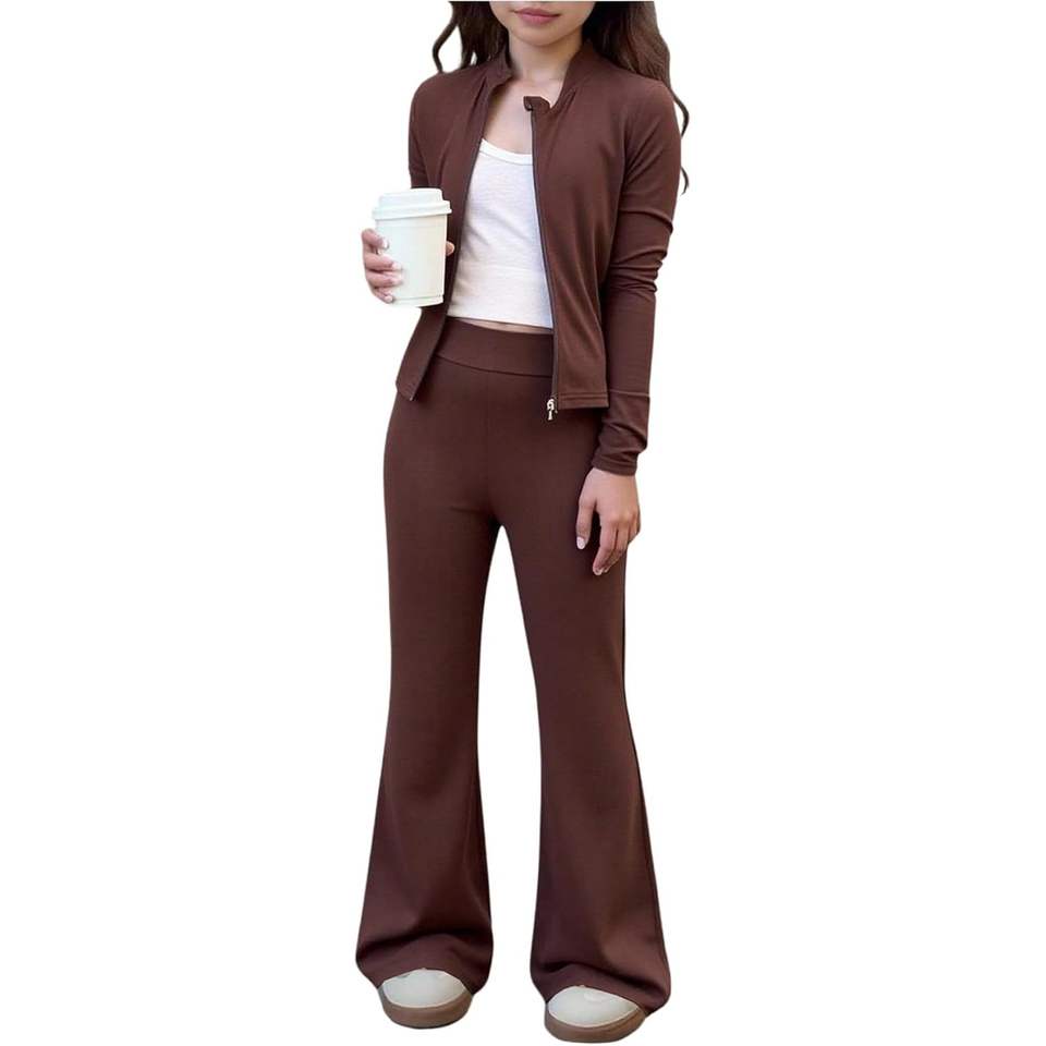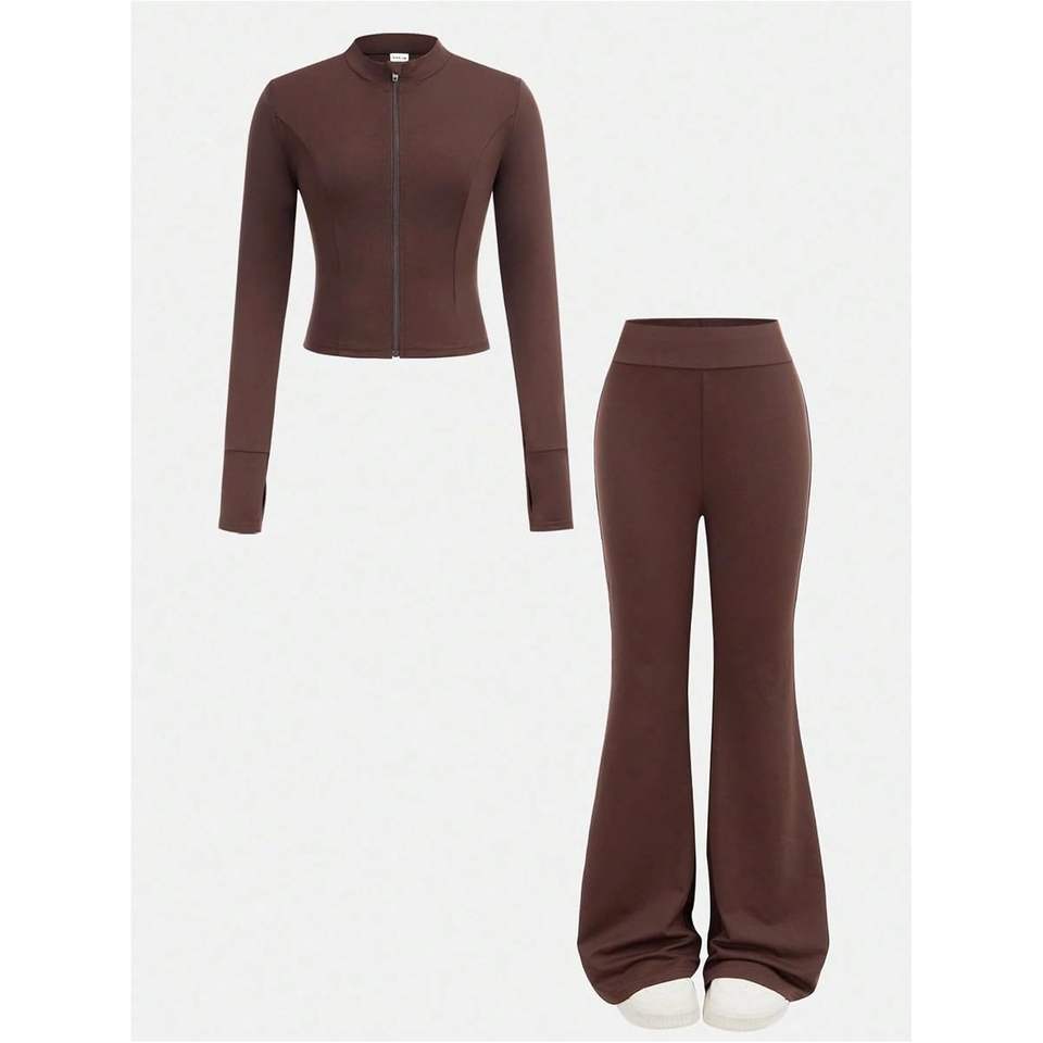 ชุดเซ็ต 2 ชิ้นสำหรับผู้หญิง เสื้อแจ็คเก็ตซิปและกางเกงขาบาน แขนยาว ผ้าเมมโมรี่ ระบายอากาศได้ดี สไตล์ลำลองแนวสตรีทแวร์