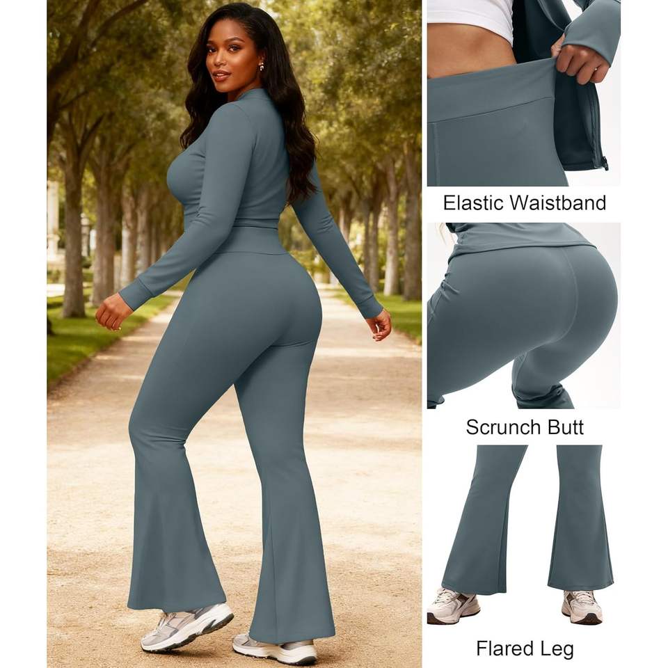 ชุดวอร์มผู้หญิงแบบ 2 ชิ้น เสื้อแจ็คเก็ตแขนยาว กางเกงเลกกิ้งขาบานยาวระดับข้อเท้า ชุดลำลองเข้าชุด ระบายอากาศได้ดี