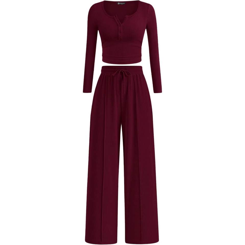 ชุดลำลองผู้หญิงแฟชั่นฤดูใบไม้ร่วงปี 2025 เสื้อแขนยาวทรงเฮนลีย์และกางเกงขายาวทรงกว้าง ไซส์ XS เหมาะสำหรับการเดินทาง