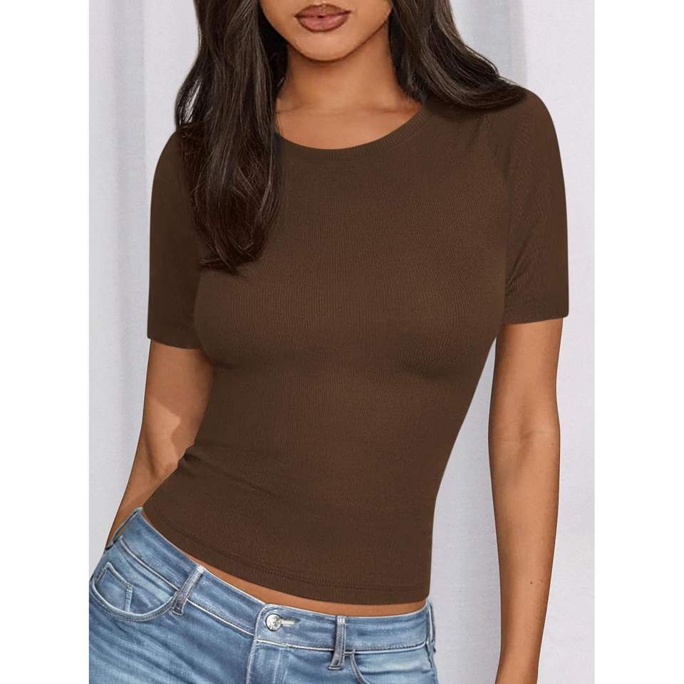 เสื้อยืดคอกลมแขนสั้นทรงเข้ารูปสไตล์ลำลองสำหรับผู้หญิง คอลเลคชั่นฤดูร้อน 2025 ผ้าถักแบบริบ