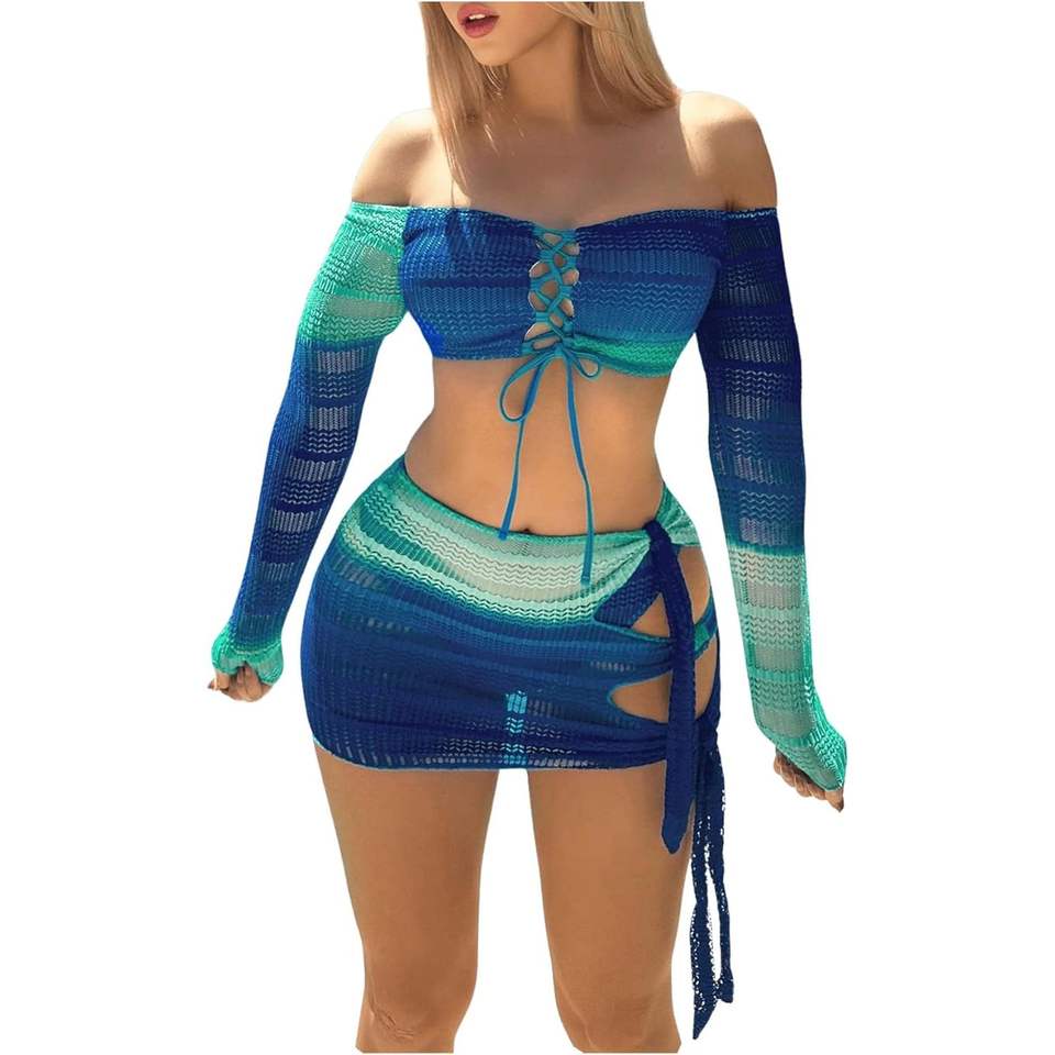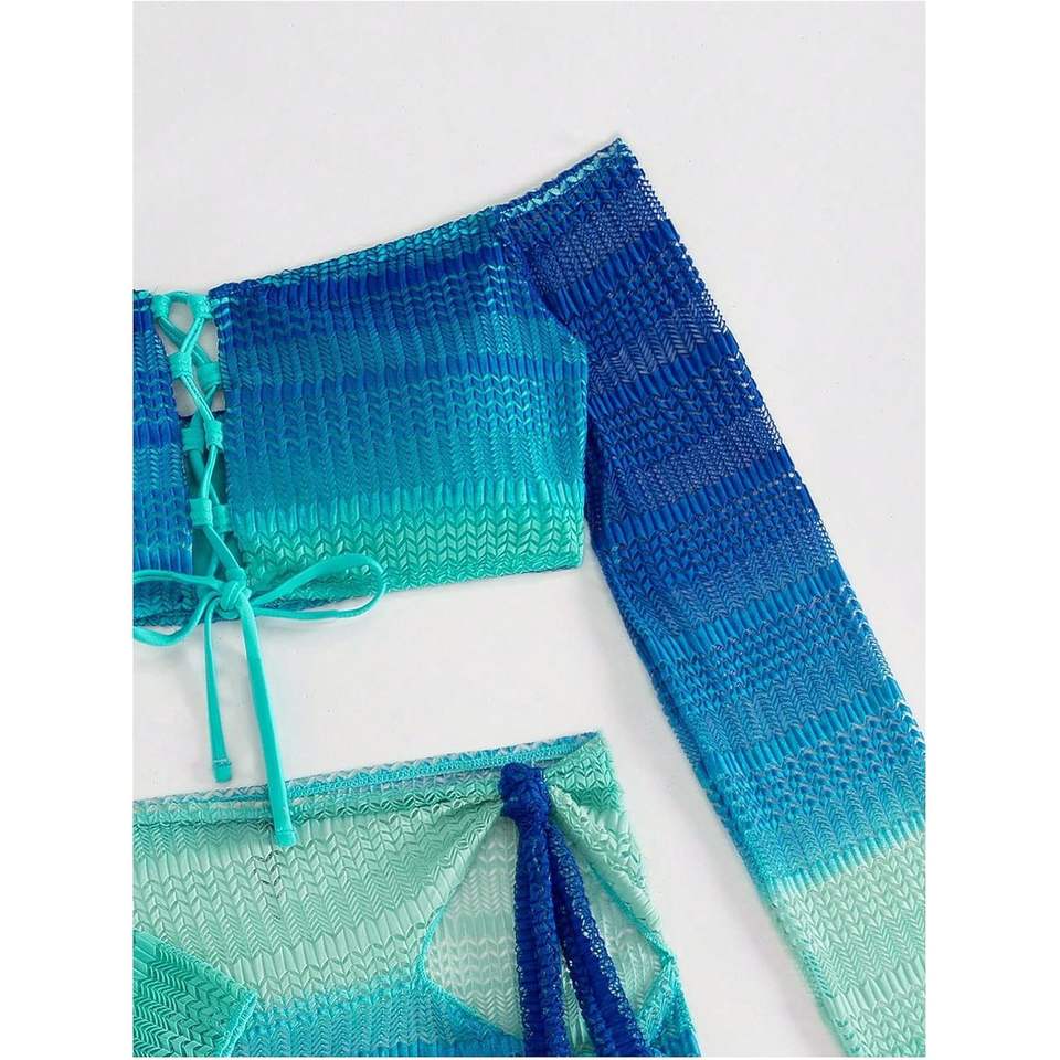 ชุดว่ายน้ำผู้หญิงแบบ 3 ชิ้นไล่เฉดสี ดีไซน์เปิดไหล่ พร้อมกระโปรงชายหาด ชุดบิกินี่แบบเว้าลายฉลุ ยืดหยุ่นได้
