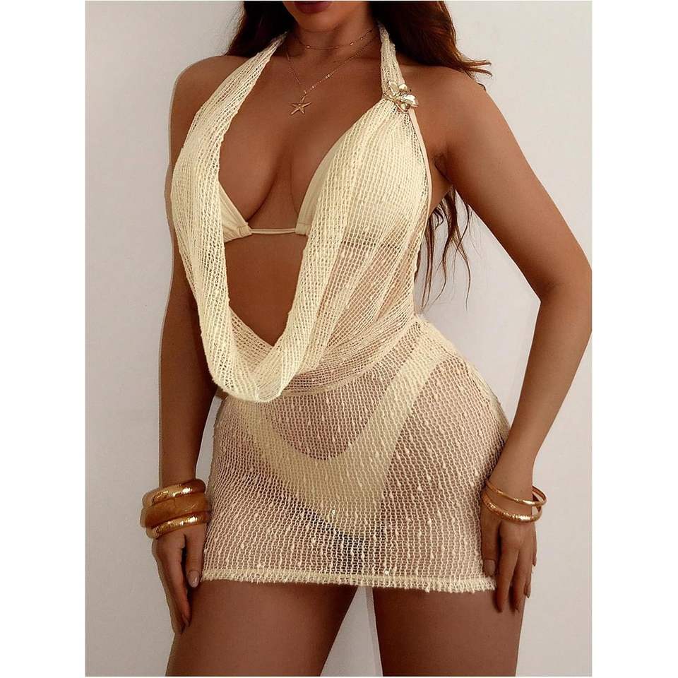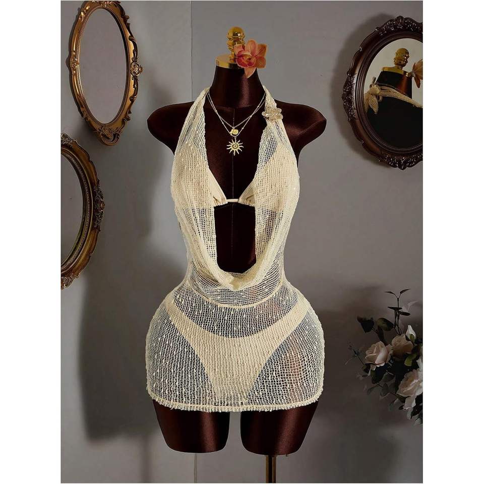 ชุดว่ายน้ำผู้หญิงแบบ 3 ชิ้น ชุดบิกินี่แบบผูกคอ ชุดเดรสถักโครเชต์รัดรูปเอวเข้ารูป ชุดคลุมชายหาด