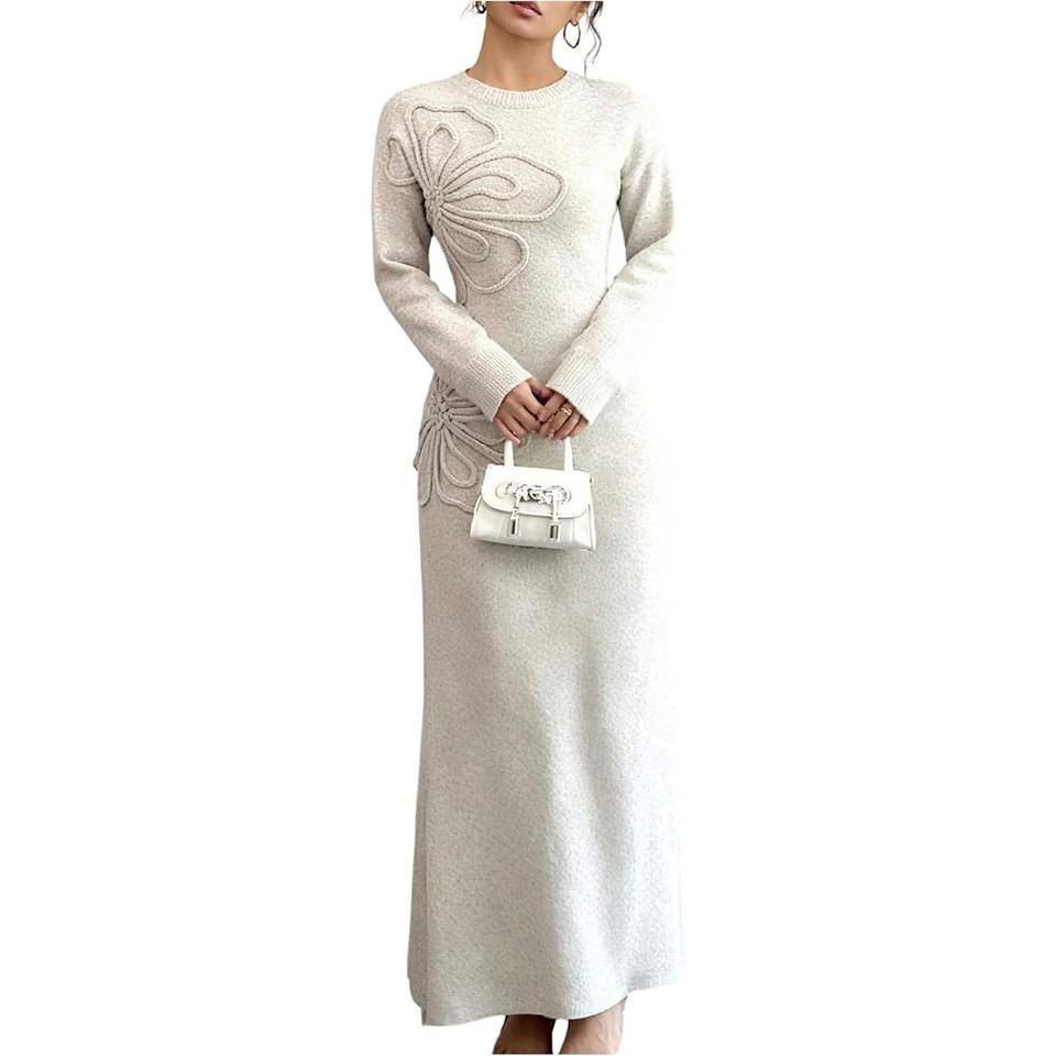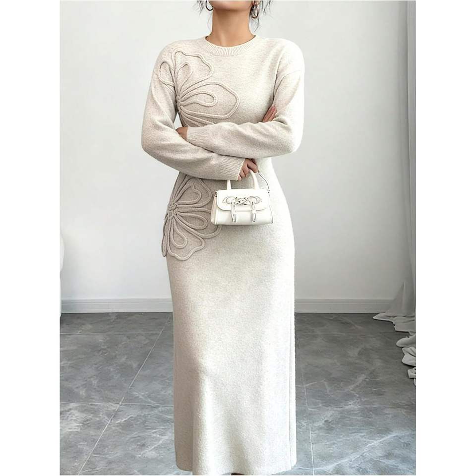 เดรสไหมพรมถักลายดอกไม้ 3 มิติ สำหรับผู้หญิง แขนยาว คอกลม ทรงเข้ารูป เอวธรรมชาติ เหมาะสำหรับฤดูใบไม้ร่วงและฤดูหนาว