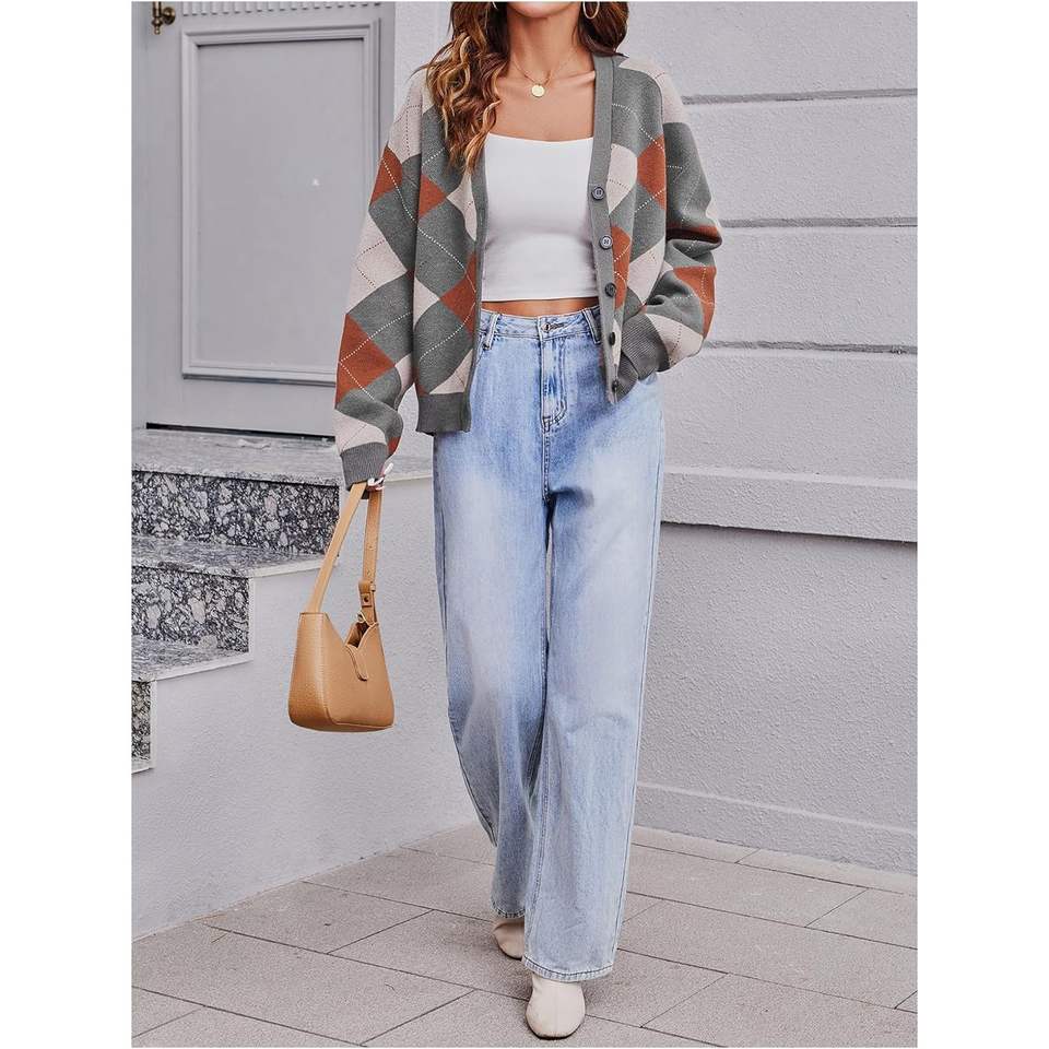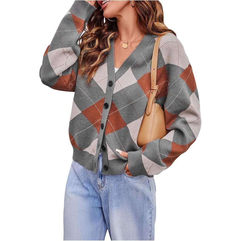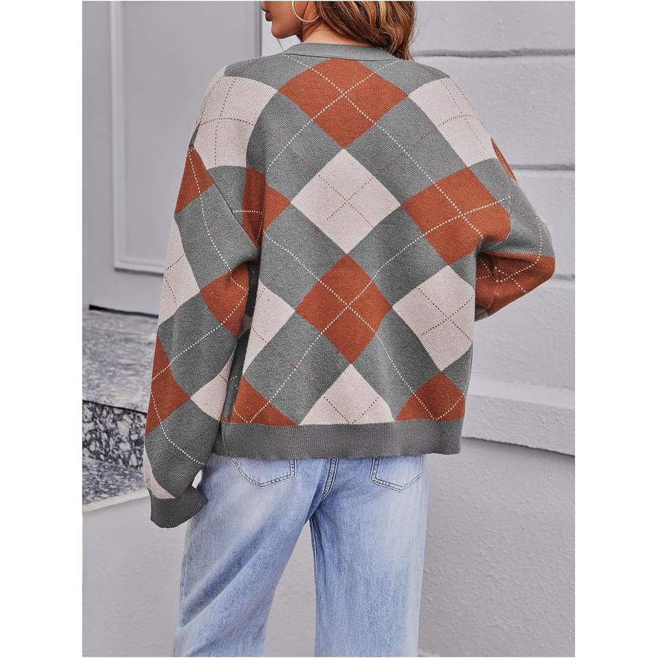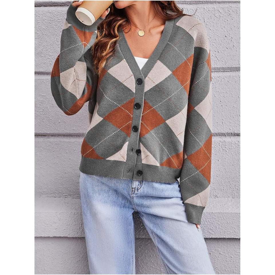 เสื้อคาร์ดิแกนลายสก็อตสำหรับผู้หญิง คอวี ติดกระดุม แขนยาว สไตล์ลำลอง ถักนิต สำหรับใส่ในฤดูใบไม้ร่วง