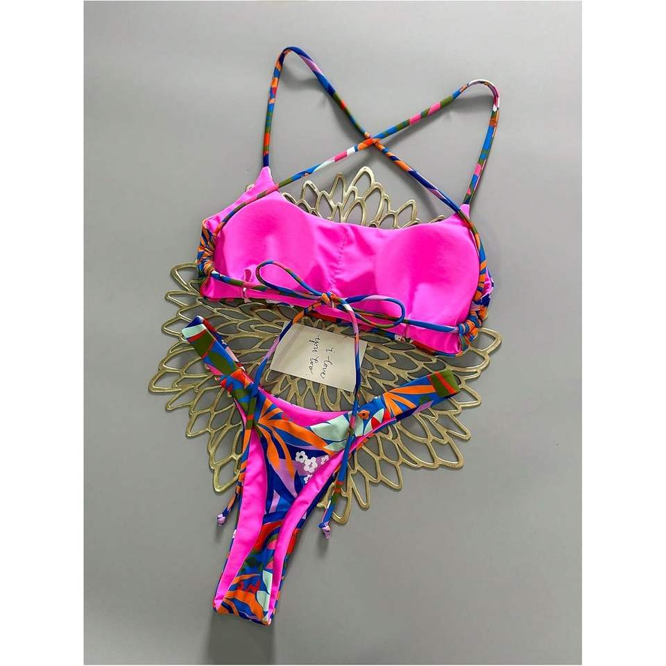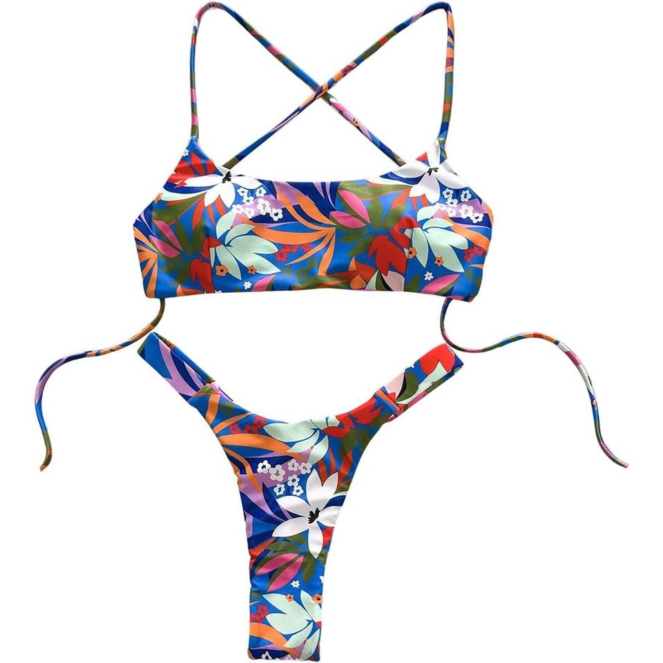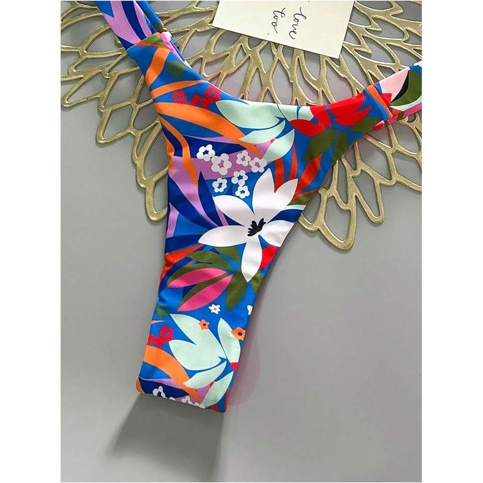 ชุดบิกินี่ลายดอกไม้สไตล์โบฮีเมียนสำหรับผู้หญิง สายคล้องคอไขว้ สายสปาเก็ตตี้ ทรงเว้าสูง ชุดว่ายน้ำสองชิ้น ผ้าเนื้อยืด
