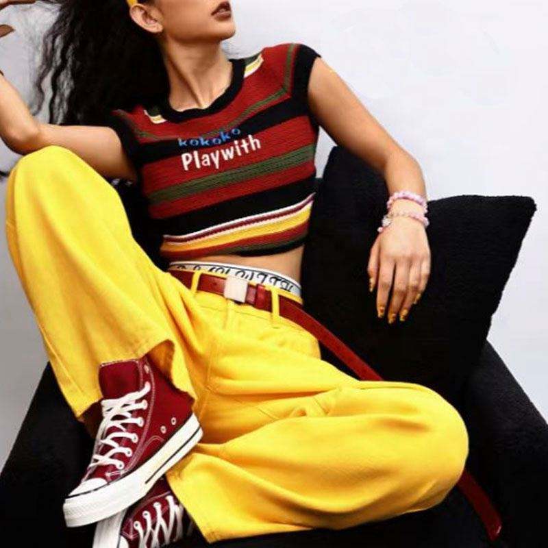 เสื้อครอปถักสำหรับผู้หญิงระบายอากาศได้ดีเสื้อถักแขนกุดลายทางลำลองตกแต่งโลโก้ไม่เป็นแผ่น