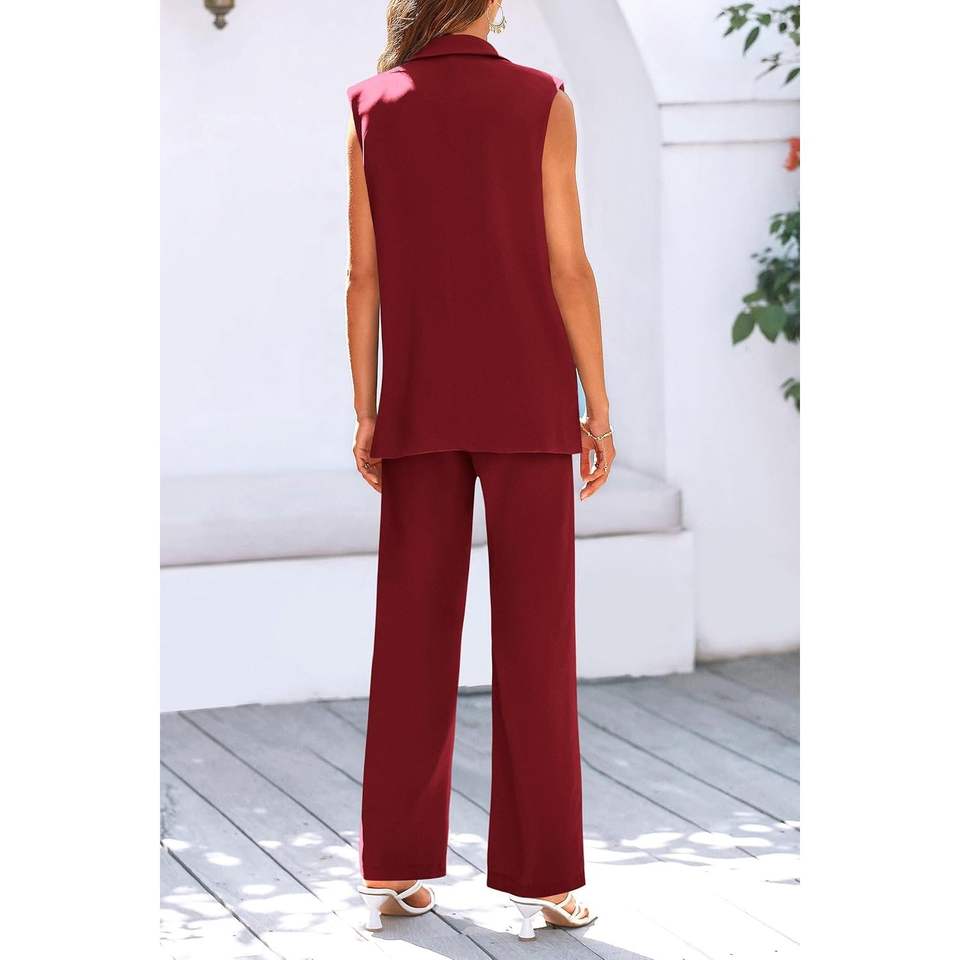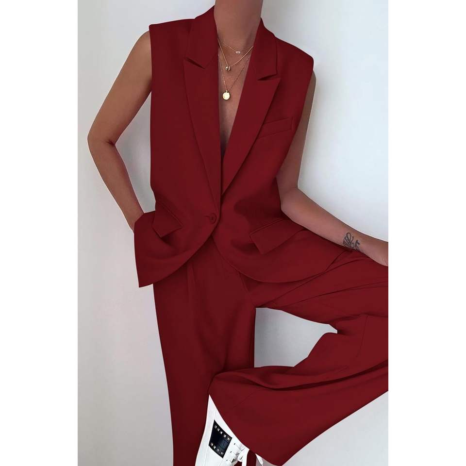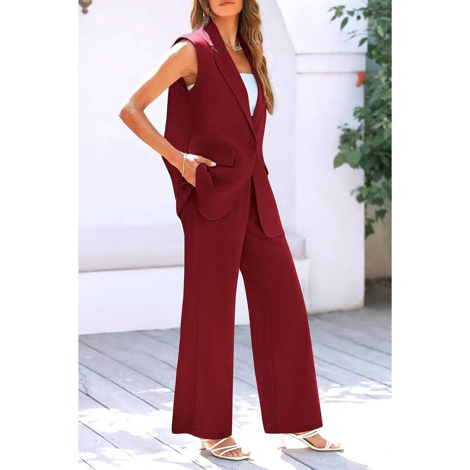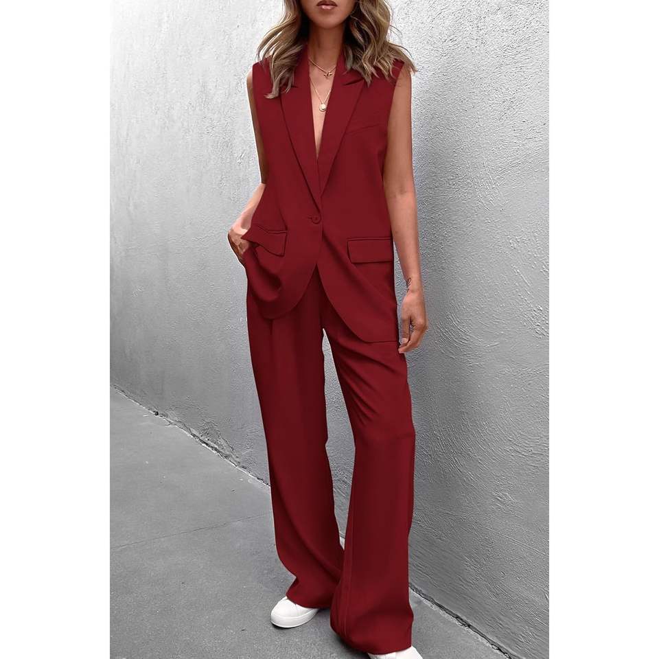 ชุดสูทลำลองสำหรับผู้หญิงแบบ 2 ชิ้น เสื้อกั๊กสูทแบบไม่มีแขนและกางเกงขายาวทรงกว้าง สไตล์ลำลอง