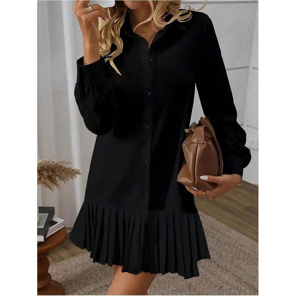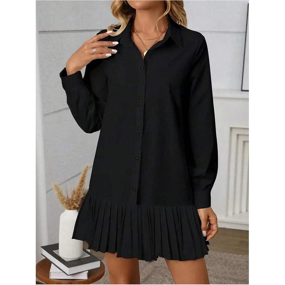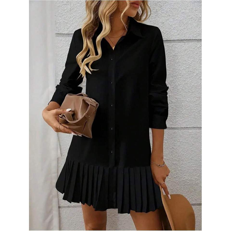 เดรสเชิ้ตผู้หญิงแบบติดกระดุม แขนยาว จับจีบ ทรงสวิง มินิเดรสลำลอง เอวธรรมชาติ ผ้าทอ