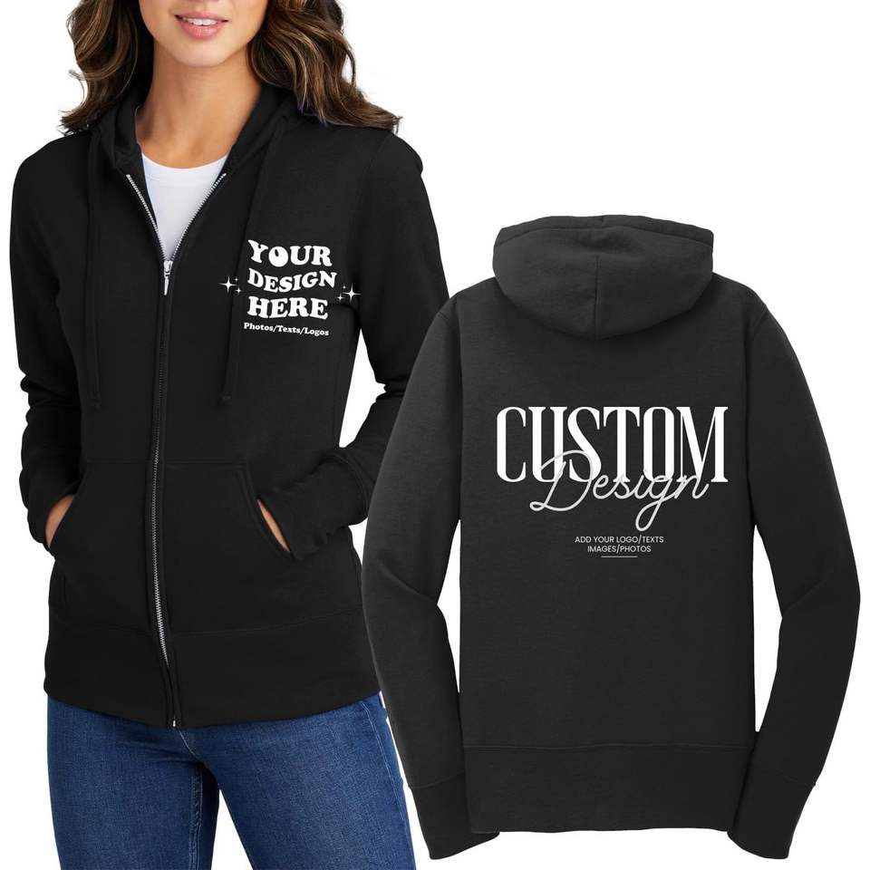 เสื้อฮู้ดผ้าฟลีซแบบมีซิปสำหรับผู้หญิง พิมพ์ลายตามสั่ง เพิ่มโลโก้ ข้อความ และรูปภาพ
